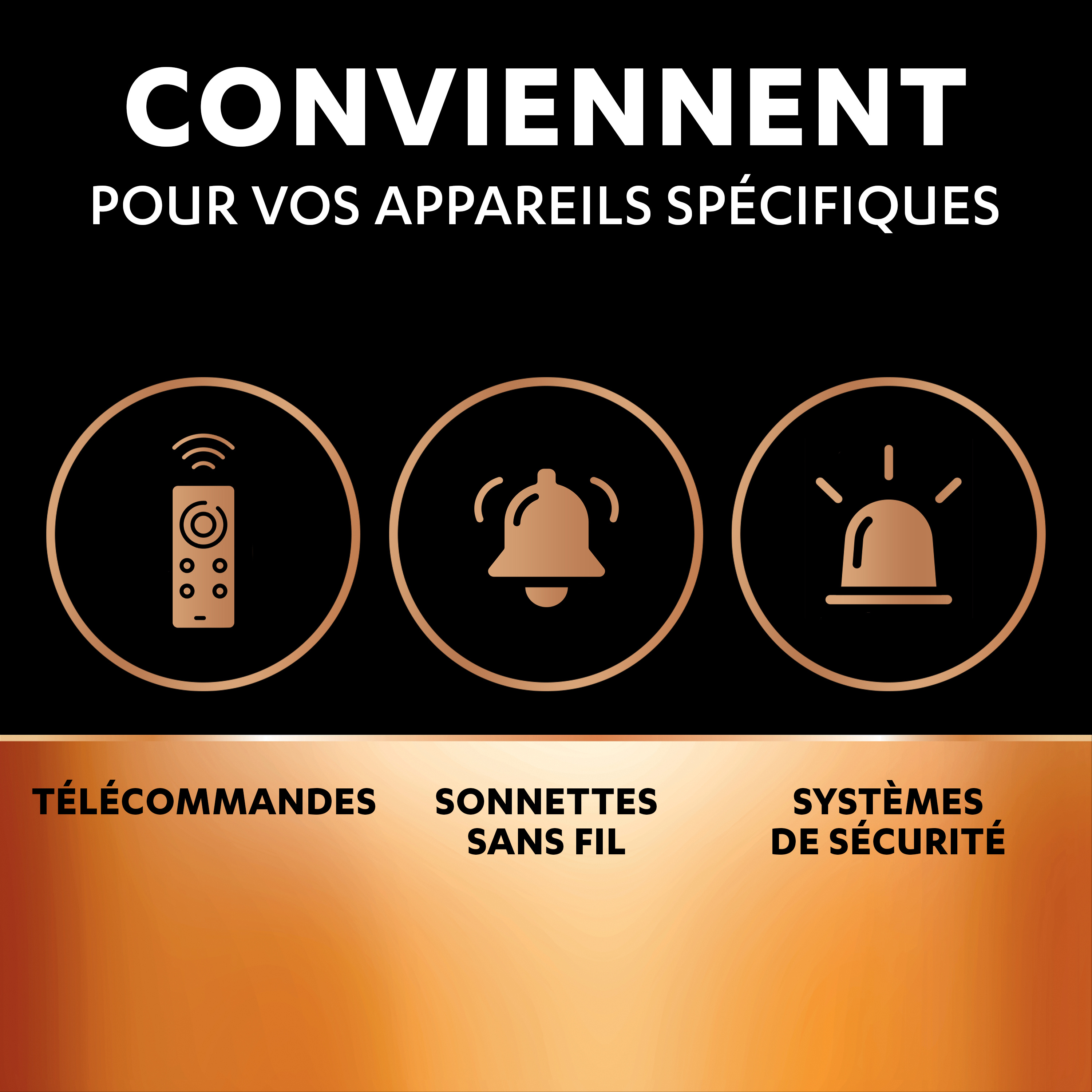 Les piles alcalines spéciales DURACELL MN21 sont garanties longue durée pour vos appareils spécifiques. Elles conviennent pour les télécommandes, les sonnettes sans fil, les systèmes de sécurité (alarmes, localisateurs) et bien d’autres encore. Avec une conservation de stockage garantie jusqu’à 5 ans, vous avez l’assurance qu’elles seront prêtes quand vous en aurez besoin.