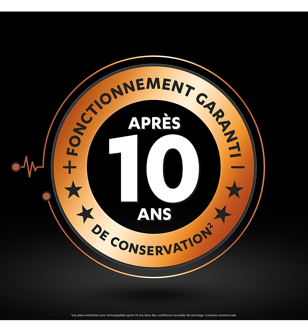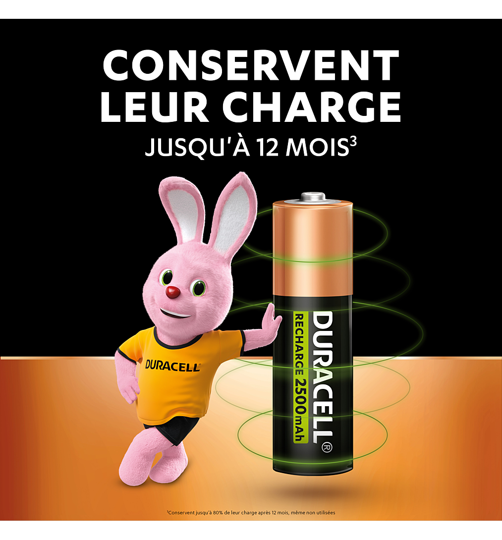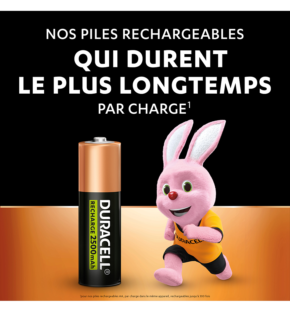 Grâce à ses piles longue durée, Duracell vous donne la puissance d'en faire plus ! Nos piles rechargeables AA NiMH 2500 mAh sont idéales pour les appareils énergivores comme les manettes Xbox, les tournevis, les jouets, les appareils photo numériques et plus encore. Elles peuvent être rechargées des centaines de fois et sont nos piles rechargeables qui durent le plus longtemps par charge*. Lorsqu’elles ne sont pas utilisées, elles resteront chargées jusqu'à 12 mois**. Chaque pile est soumise à des tests approfondis pour détecter les fuites, contrôler la qualité et la sécurité afin de vous garantir la meilleure qualité possible de la part de Duracell. Fonctionnement garanti après 10 ans de conservation***. *Pour nos piles rechargeables AA, par charge dans le même appareil, rechargeables jusqu’à 300 fois, **Les piles inutilisées sont rechargeables après 10 ans dans des conditions normales de stockage. Garantie commerciale ***Conservent jusqu'à 80% de leur charge après 12 mois, même non utilisées