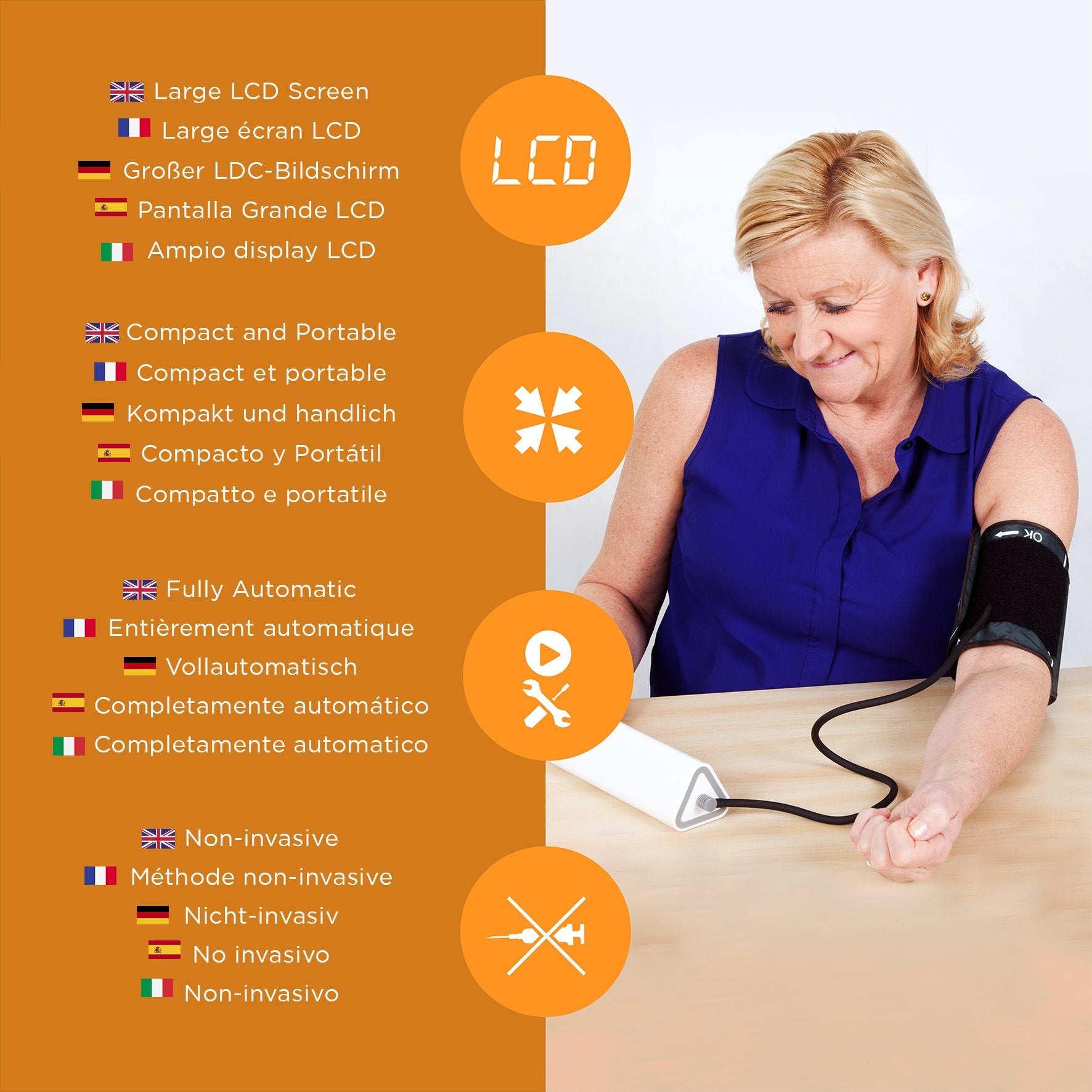 Fonctionnant par simple pression d'une touche, ce tensiomètre électronique a été ergonomiquement conçu pour être utilisé aisément. Doté d'un large écran LCD, les chiffres s'affichent en grand pour une lecture facilitée à tous ceux qui souffrent de myopie ou de presbytie. Avec ses 3 indicateurs de mesure, cet appareil donne toutes les informations que les professionnels de la santé utilisent: pouls (battements par minute), tension systolique et diastolique (SYS et DIA en Mmhg).
