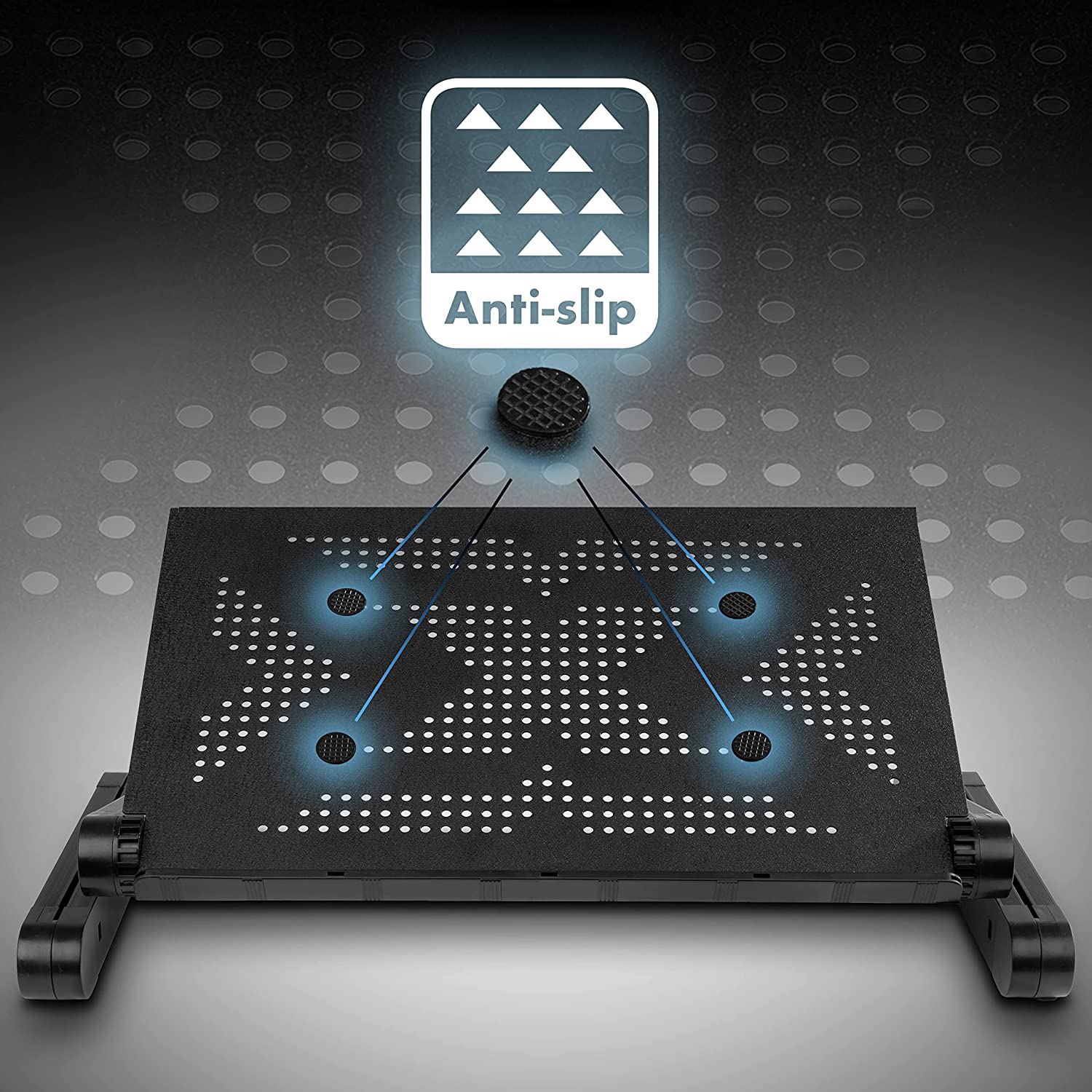 La surface de ce support est équipée de 7 coussinets en caoutchouc qui sont judicieusement positionnés pour saisir les appareils plus grands (comme un ordinateur portable ou un projecteur) et les plus petits (comme une tablette ou un livre) afin d'en minimiser tout mouvement et maintenir l'article fermement en place. Il dispose également d'un rebord pour empêcher l'objet de glisser vers l'avant lorsqu'il est incliné. La plate-forme a un dos en maille afin de ventiler vos appareils.