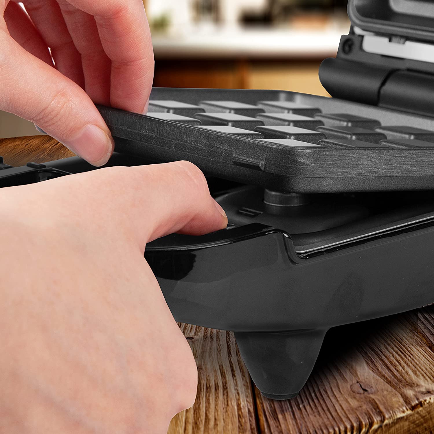 Puisque ce mini gaufrier peut également être utilisé comme grill, cela signifie que les plaques de cuisson sont détachables, autant celles du haut que celles du bas, ce qui facilite leur nettoyage. Une fois votre repas fini, vous n'avez alors qu'à les enlever de l'appareil et les laver avec de l'eau et du savon. Quel gain de temps et quelle facilité !