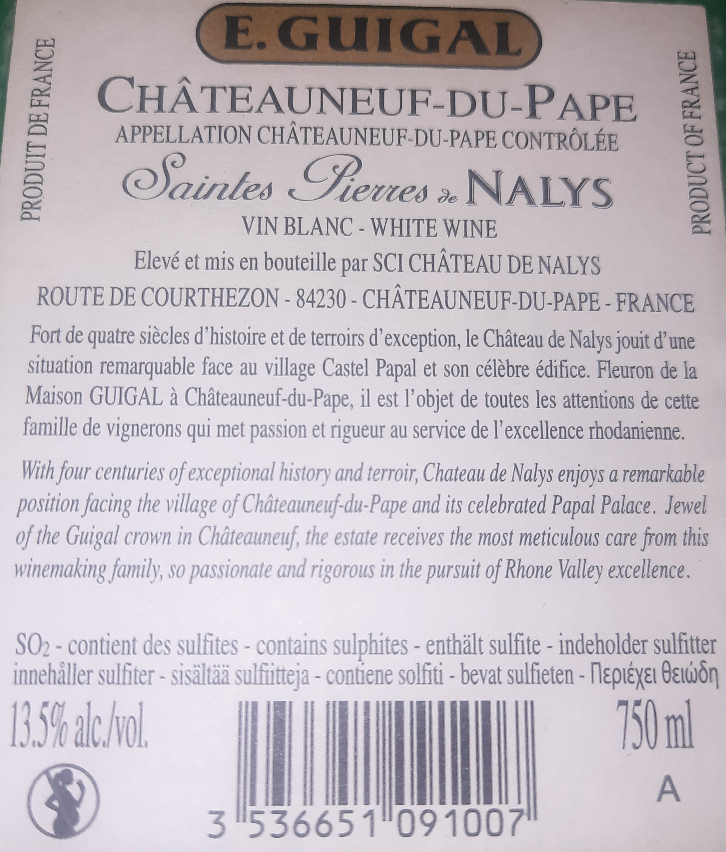 | Libellé | E. Guigal Saintes Pierres de Nalys, 2020 - Châteauneuf-du-Pape AOP - Blanc Sec - 75 cl - étiquette abîmée |