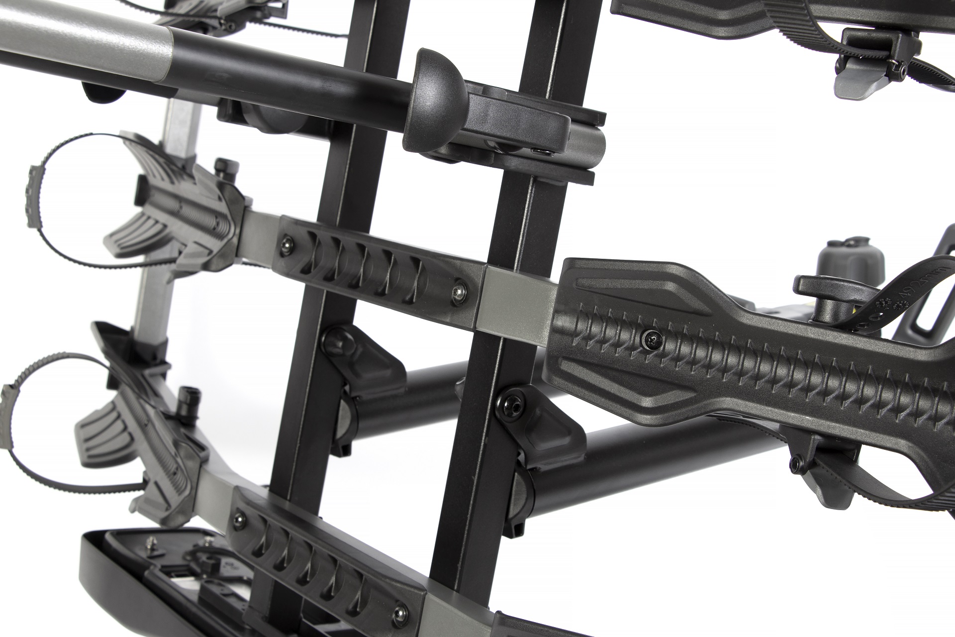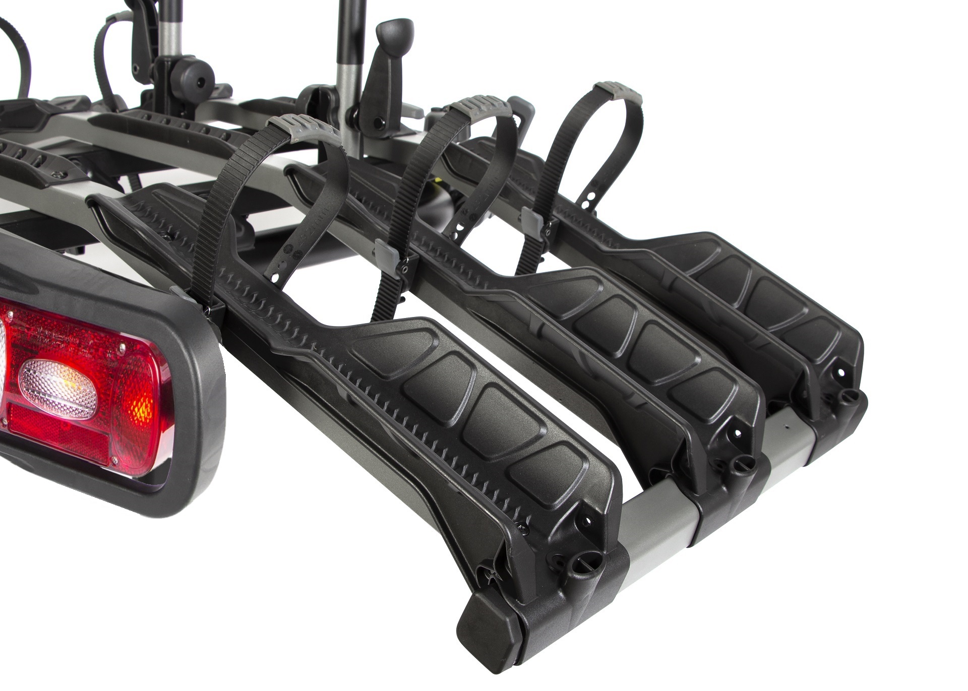 Le E-HORNET 3 est conçu pour transporter 3 vélos électrique. Montage facile avec une grande stabilité du système de serrage conique. Les sangles à cliquet à dégagement rapide et la conception unique du berceau permettent de charger les vélos rapidement et facilement. Inclinable pour garder l'accès au coffre même chargé avec les vélos. Antivol sur attelage et sur pince vélo, Taille max vélo : accepte des vélos jusqu'à 132 cm d'empattement en 29'', Norme XP R-18 904-4. Tableau d'éclairage avec prise 13 broches. Charge max de 60 Kg (30Kg max par vélo). Dimensions (Largeur x profondeur x hauteur): 130 x 88 x 89cm (24cm plié)