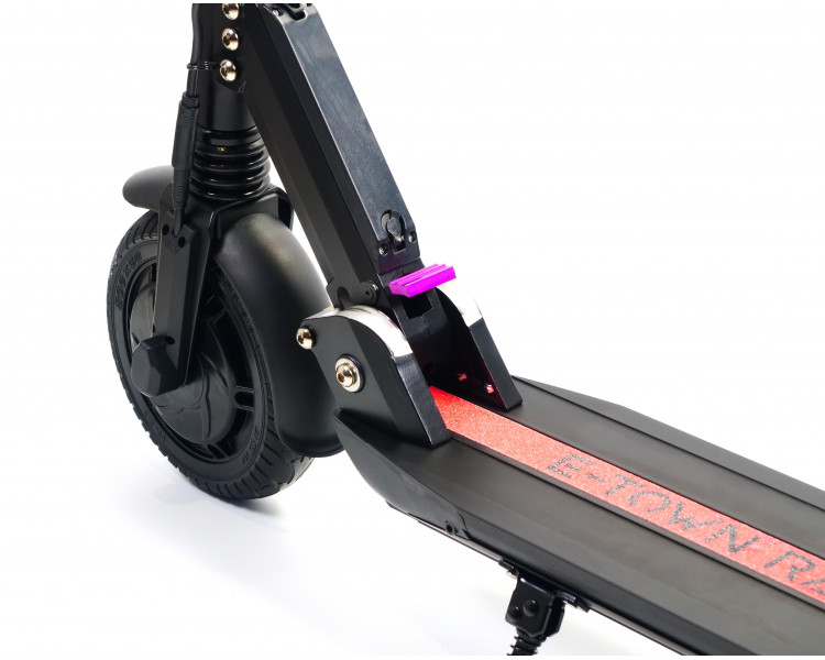 La trottinette électrique E-Town Racer est un moyen de transport écologique et efficace qui vous fera vite oublier les longs trajets en transport en commun ou les embouteillages. Son petit gabarit, son poids limité à 10,8 kg et son système de pliage ultra simple et rapide vous permettront de la transporter partout et de l'utiliser au quotidien sans être encombré. REGULATEUR DE VITESSE INTEGRE : Avec la trottinette E-Town Racer il est possible de contrôler votre vitesse en l'adaptant à votre trajet grâce au régulateur de vitesse. 3 modes de vitesse sont sélectionnables : 6km/h, 12 km/h et vitesse non bridée. Par défaut la trottinette est réglée sur le mode 1 limité à 6 km/h ECRAN MULTIFONCTIONS LED INTEGRE : Garder un œil sur le trajet avec le compteur qui vous indique la vitesse en temps réel, l'autonomie restante et distance parcourue. Pourvue d'un large écran couleurs multifonctions LED, la E-Town Racer vous offre une parfaite lisibilité de vos informations de pilotage HAUTEUR AJUSTABLE : Colonne de direction réglable en hauteur sur trois niveaux pour ajuster le guidon à toutes les tailles d'utilisateurs. SUSPENSIONS AVANT ET ARRIERE : Des suspensions avant et arrières afin de rendre votre trajet plus confortable ! ECLAIRAGE LED AVANT + FREINAGE ARRIERE : l'éclairage LED avant et large feu stop arrière vous permettent des déplacements nocturnes en conservant une visibilité et sécurité optimales. MOTEUR - BATTERIE : Le moteur brushless de 250 Watts est recommandé pour des gabarits jusqu'à 80 kg, pour un usage sur routes sans dénivelé, jusqu'à une vitesse max d'environ 22 km/h. La batterie lithium de 36V 6000 mAh offre une autonomie d'environ 22 km et un temps de recharge rapide. ROUES : Ses roues de 8 pouces (20 cm) avec pneus plein et gomme médium procurent un excellent confort de roulage, une tenue de route sécurisante et évitent les crevaisons Recommandation : pour la sécurité de l'utilisateur et la longévité de la trottinette il est déconseillé de rouler sous la pluie, sur chaussée humide ou dans les flaques d'eau.