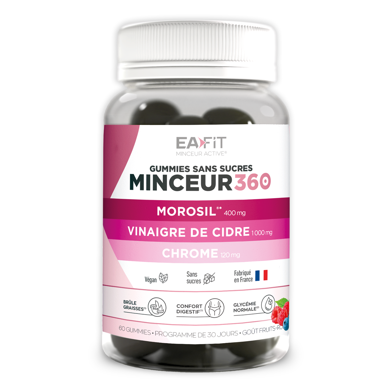 ENVIE DE MINCIR EN VOUS FAISANT PLAISIR ? EAFIT Minceur a développé Minceur 360 gummies perte de poids alliant les actifs les plus tendances et recherchés : • Morosil : Issu de l’orange Moro originaire de Sicile, cet actif a fait l’objet de deux études scientifiques démontrant une amélioration des bénéfices sur la silhouette. • Vinaigre de cidre de pomme : traditionnellement reconnu et utilisé pour ses bienfaits sur le bien-être et la digestion. • Chrome: contribue au maintien d’une glycémie normale. • Noix de kola vient compléter la formule pour aider à brûler les graisses et à soutenir vos programmes de perte de poids. Ces gummies sont formulés sans sucre, conviennent aux végétariens. Délicieux goût fruits rouges.