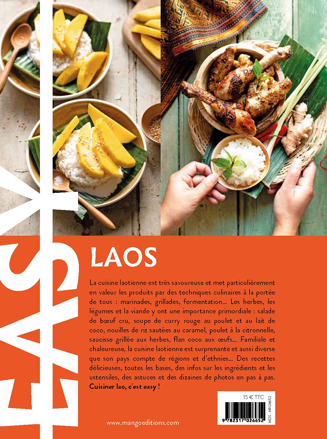 Méconnue, car souvent effacée par ses cousines thaïlandaise et vietnamienne, la cuisine laotienne est une cuisine délicieuse qui met particulièrement en valeur les produits par des techniques culinaires originales et à la portée de tous : marinades, grillades, fermentations… Les herbes, les légumes et la viande y ont une importance primordiale. Salade de bœuf cru, curry rouge de poulet au lait de coco, soupe de bœuf et pâtes de riz, poulet grillé à la citronnelle saucisses grillées aux herbes, flan coco aux œufs… Familiale, chaleureuse et conviviale, la cuisine laotienne est surprenante et riche des métissages et héritages coloniaux qui composent l’histoire de son pays… Des recettes délicieuses, toutes les bases, des infos sur les ingrédients et les ustensiles, des astuces et des centaines de photos en pas à pas. Cuisiner lao, c’est easy !