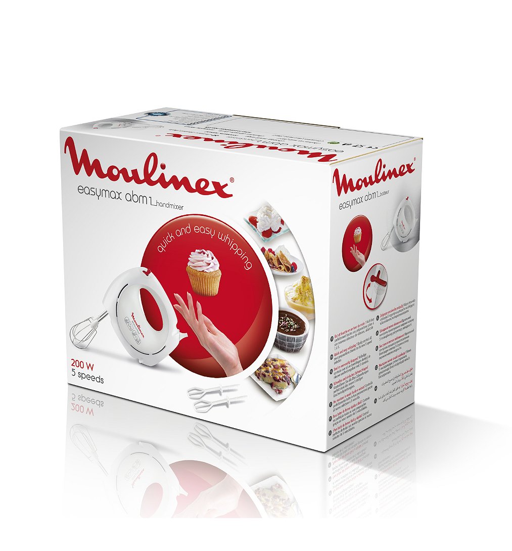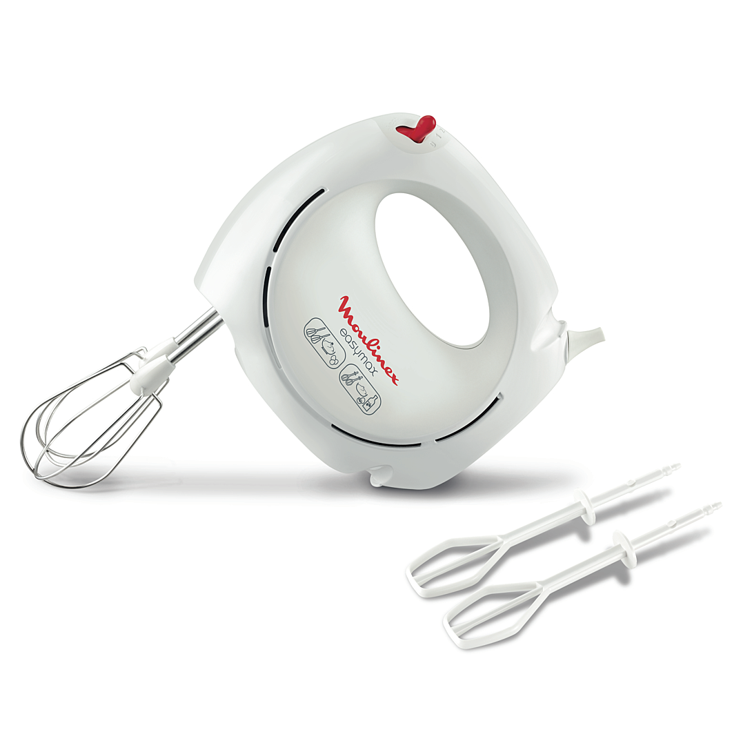 Bat et fouette en un tour de main ! Battez des blancs en neige, réalisez de savoureuses crèmes fouettées ou mélangez vos pâtes à gâteaux avec le batteur Easymax de Moulinex. Ergonomique et ultra pratique, son bouton de commande unique permet de choisir la vitesse ou d'éjecter les fouets. Grâce à ses 200 watts de puissance, ses 5 vitesses et ses 2 jeux de fouets (1 en plastique et 1 en acier inoxydable), blancs en neige ou crèmes fouettées sont préparés facilement et rapidement. Compact, votre batteur Easymax sera toujours à portée de main pour vous aider à réaliser de délicieuses pâtisseries et trouvera aisément sa place dans votre cuisine.