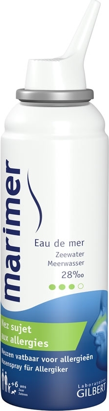 Gilbert Marimer Eau de Mer Nez Sujet aux Allergies 100 ml est une solution naturelle d'eau de mer hypertonique enrichie en cuivre et manganèse qui permet : - d'évacuer les allergènes, les impuretés et les sécrétions, - de soulager naturellement la congestion nasale, - d'améliorer l'efficacité des traitements médicamenteux topiques et d'en réduire leur utilisation, - d'humidifier la muqueuse et de prévenir son dessèchement lié à l'usage des médicaments. Ce flacon est conseillé en cas de nez bouché, nez qui coule, éternuements, rhinite allergique.