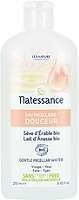 Natessance Eau Micellaire Douceur 250 ml est une eau qui élimine les impuretés et le maquillage du visage et des yeux pour une peau nette et douce. Cette eau micellaire est formulée à base de : - Sève d'Érable bio, réputée pour hydrater, protéger et adoucir les peaux fragilisées par les agressions quotidiennes. - Lait d'Ânesse bio, allié du capital beauté reconnu pour ses vertus bienfaisantes protectrice et apaisante. Testée sous contrôle dermatologique. Formule certifiée bio. 99% du total d'origine naturelle.