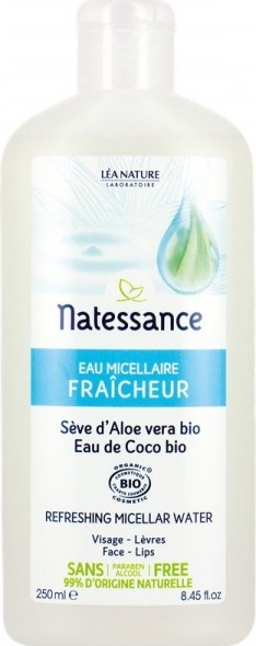 Natessance Eau Micellaire Fraîcheur 250 ml est une eau qui démaquille et libère la peau des impuretés. Cette eau micellaire est formulé à base de : - Sève d'Aloe Vera Bio, une alliée beauté, aux bienfaits réputés hydratant et protecteur. - Eau de Coco Bio, reconnue pour sa richesse minérale et son incroyable pouvoir rafraîchissant. Votre peau est nette, fraîche et confortable.