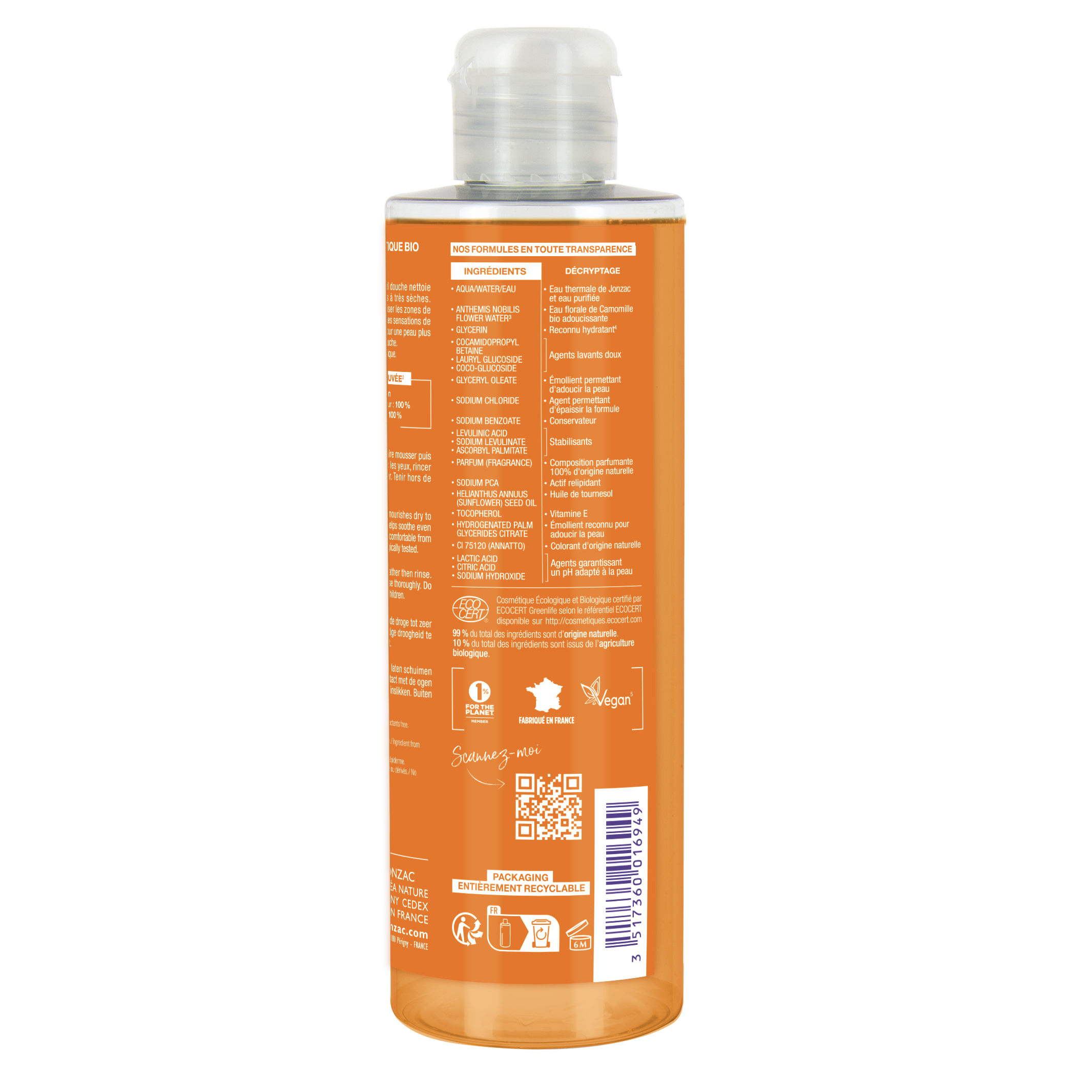 Ingrédients : Aqua/Water/Eau**, Anthemis Nobilis Flower Water*, Glycerin, Cocamidopropyl Betaine, Lauryl Glucoside, Coco-Glucoside, Glyceryl Oleate, Sodium Chloride, Sodium Benzoate, Sodium Levulinate, Parfum (Fragrance), Lactic Acid, Citric Acid, Sucrose Laurate, Sodium PCA, Sucrose Dilaurate, Helianthus Annuus (Sunflower) Seed Oil, Camellia Sinensis Leaf Extract, Centella Asiatica Extract, Sucrose Trilaurate, Tocopherol, Hydrogenated Palm Glycerides Citrate, CI 75120 (Annatto), Ascorbyl Palmitate*Ingrédients issus de l'agriculture biologique.**Eau et eau thermale de Jonzac.99 % du total des ingrédients sont d'origine naturelle.10 % du total des ingrédients sont issus de l'agriculture biologique.
