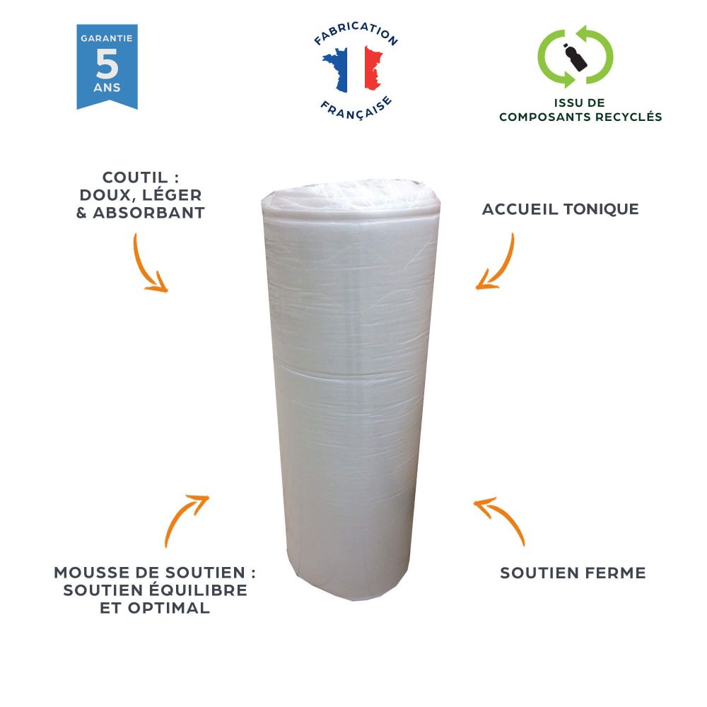 | Garnissage | Âme de 16 cm en mousse polyuréthane HDflex 30kg/m3 ; 3 zones de soutien différenciées |