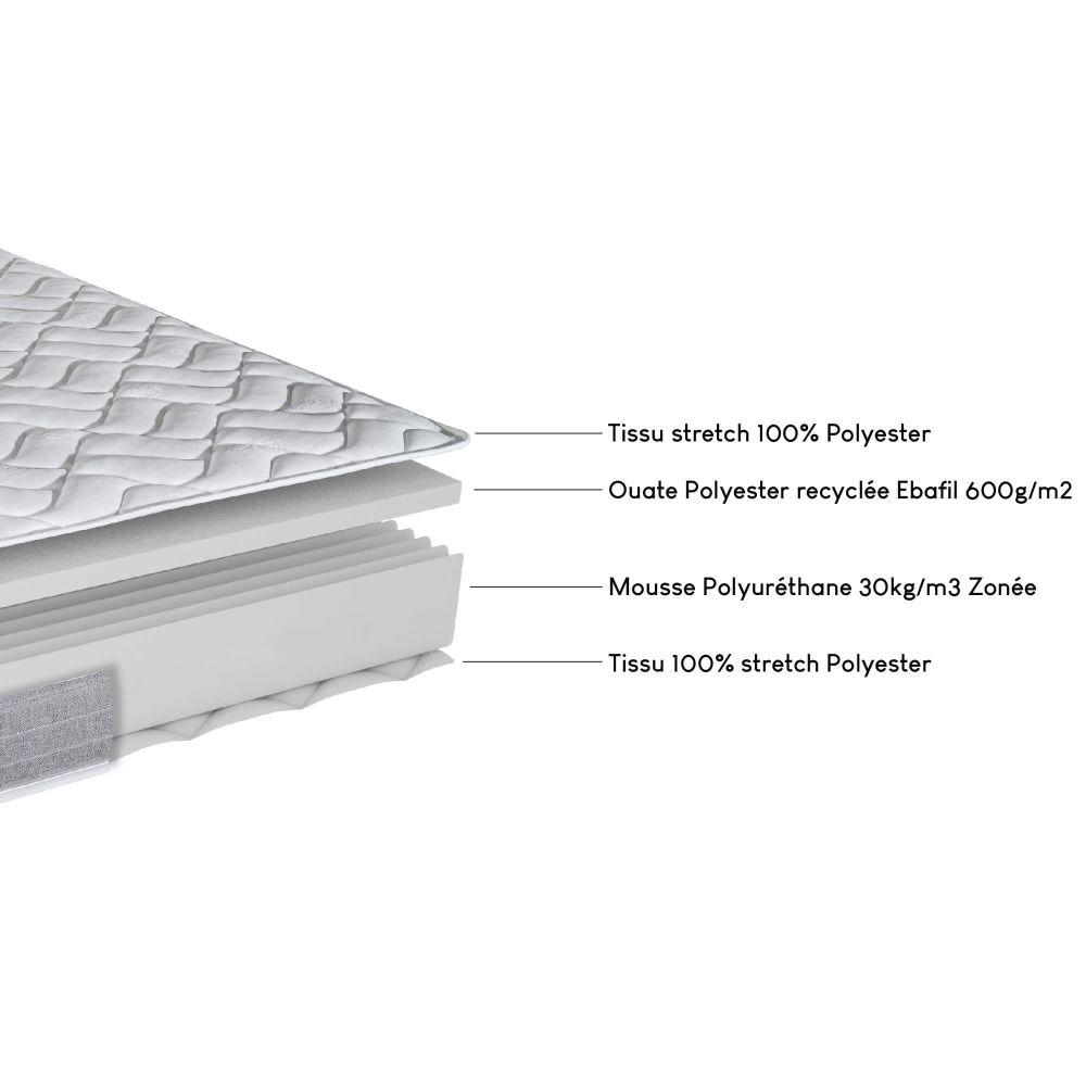 Suspension: Âme de 16 cm en mousse polyuréthane HDflex 30kg/m3 ; 3 zones de soutien différenciées