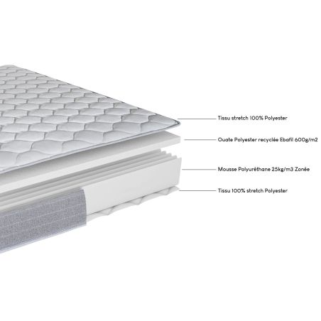 Suspension: Âme de 19 cm en mousse polyuréthane 25kgs/m3 ; 3 zones de conforts différenciées