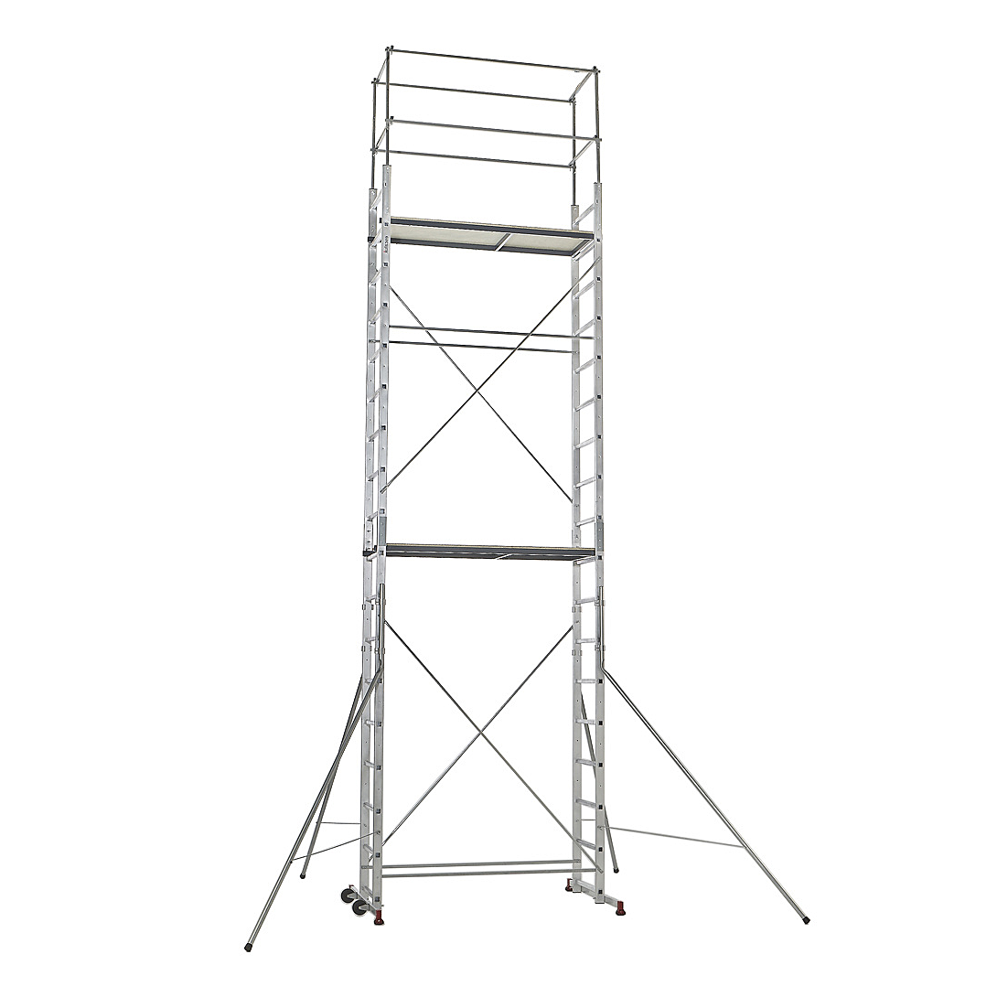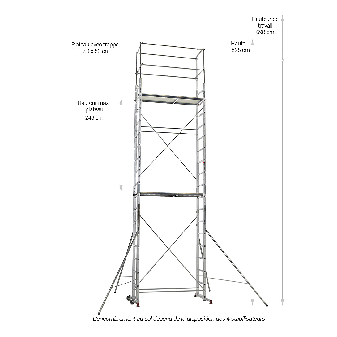 Hauteur de travail 7M00 * 2 grands plateau 150x50 avec accès par trappe * Hauteur de plateau réglable de 0,50 à 5,00 M * Réglable tous les 28 cm * 4 stabilisateurs et 2 bases élargies * 2 roues d’aide au déplacement * Garde-corps périmétrique total avec lisses et sous lisses * Garantie 2 ans * Fabrication française, NF EN 131 * NF E85-200, Classe B, usage domestique uniquement * charge maximale 150 kg.