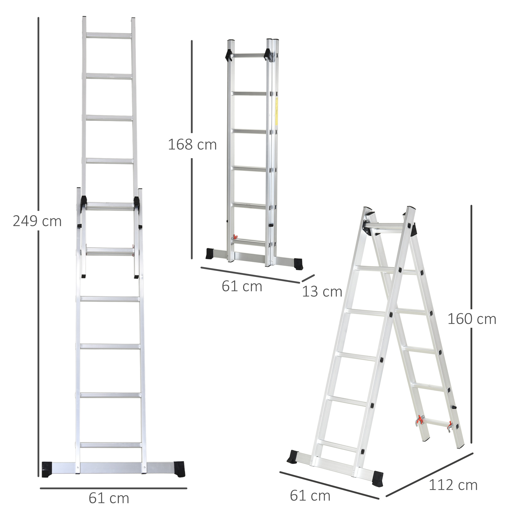 Découvrez cette échelle HOMCOM de 2,5 m, légère et robuste en aluminium, supportant jusqu'à 150 kg. Modulable en chevron pour 1,6 m de hauteur ou droite pour plus de hauteur, elle assure sécurité avec des joints d'assise solides et des bandes antidérapantes. Conforme à EN131.