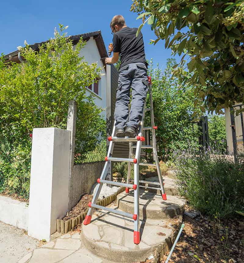 Vous pouvez choisir la position de l'échelle multifonction télescopique 4x4 échelons Hailo ProfiStep Multi en fonction de votre besoin jusqu'à une hauteur d'accès de 4m70, ce qui en fait un produit adéquat dans de nombreuses situations. Elle sera particulièrement adaptée aux travaux de façade, toiture, élagage, de taillage de haies ou d'arbres.