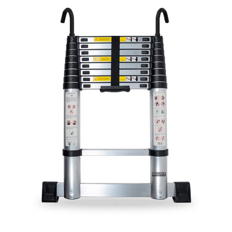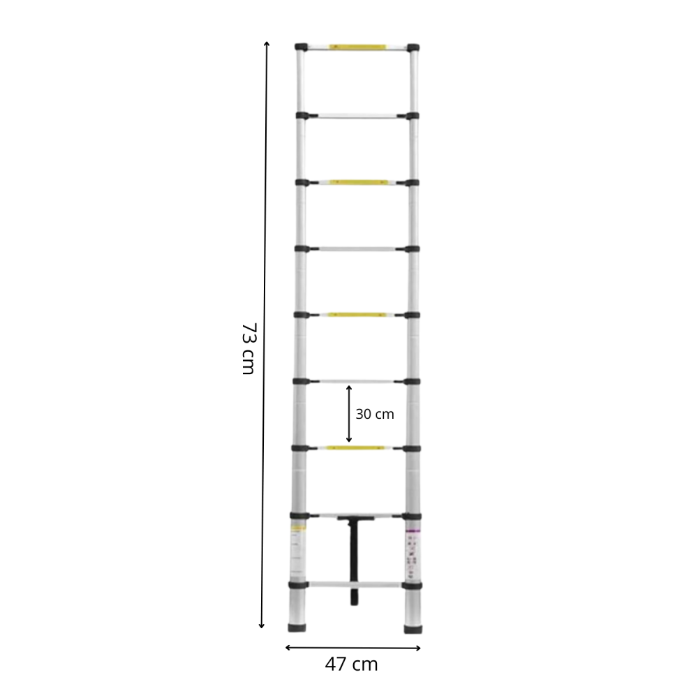 Échelle télescopique 2,6m. Pratique et solide, cette échelle télescopique en aluminium est un outil indispensable pour la réalisation de vos travaux quotidiens. Légère, vous pourrez la transporter facilement et atteindre la hauteur souhaitée grâce à son déploiement aisé et sans effort.