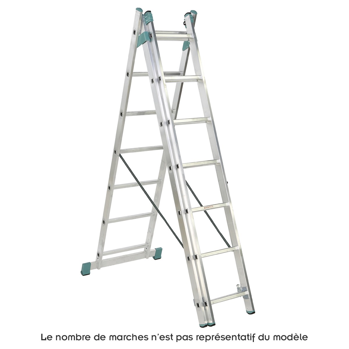 Cette échelle 3 plans peut être placée sur 2 niveaux différents et donc être utilisée dans des escaliers. Les pieds sont renforcés et les barreaux sont antidérapants. 1 plan peut être séparé des 2 autres du modèle 7 marches au modèle 10 marches.