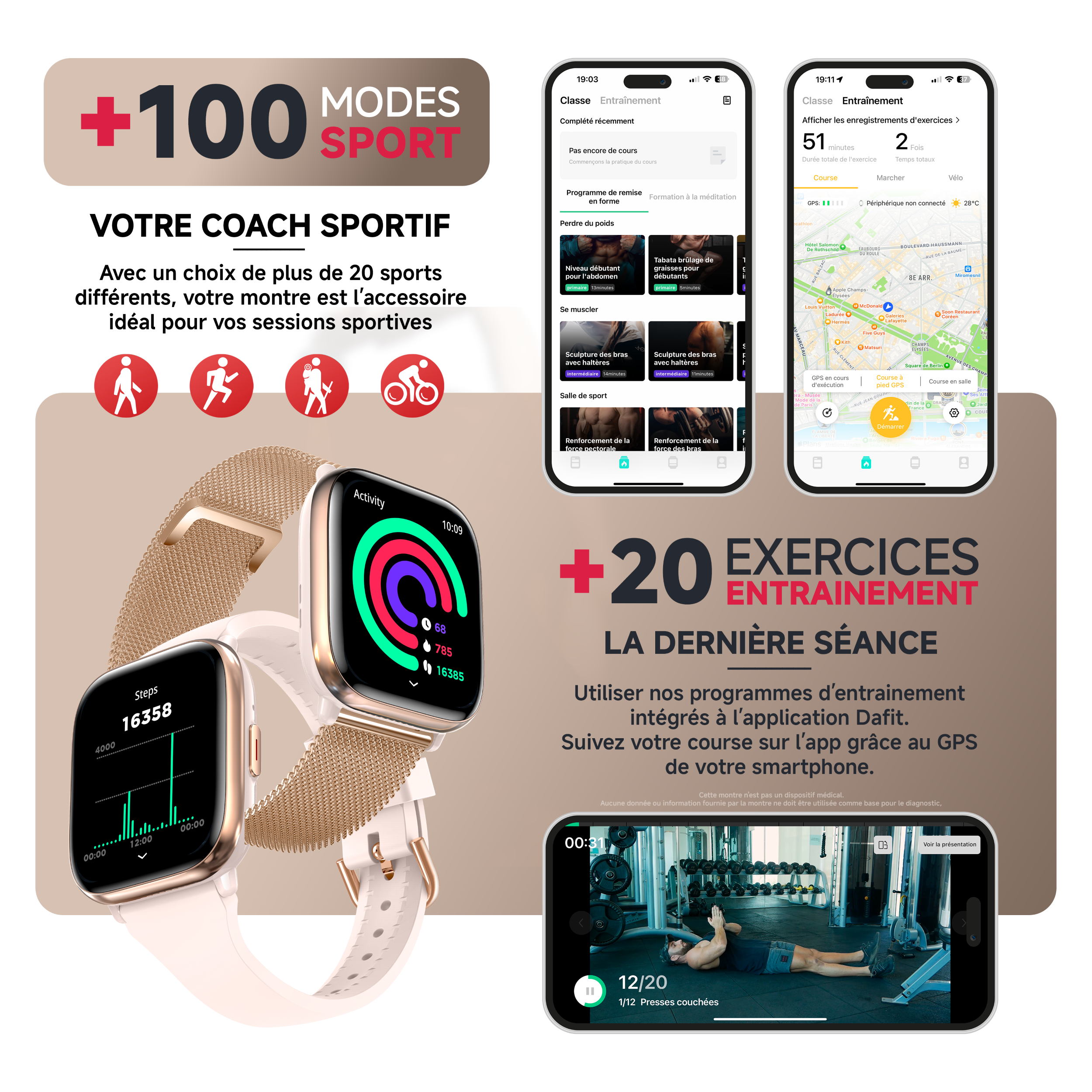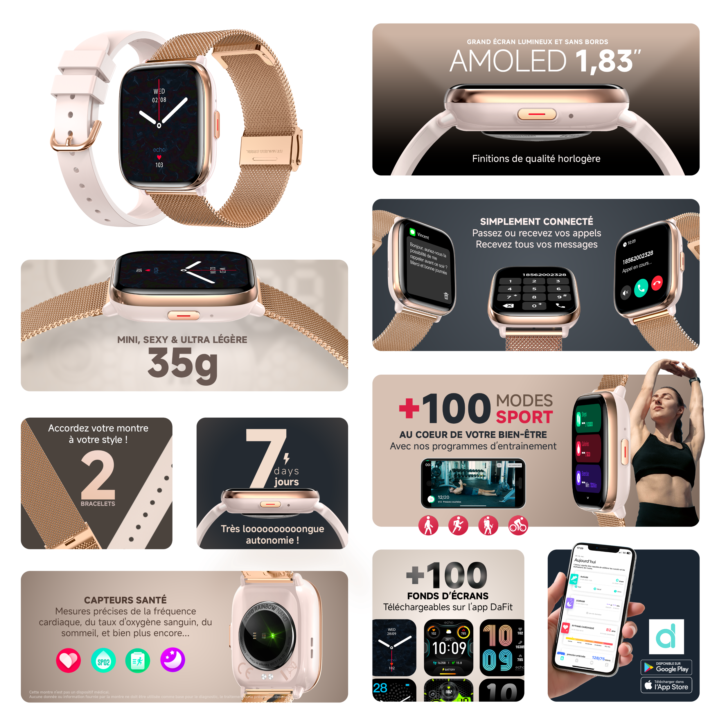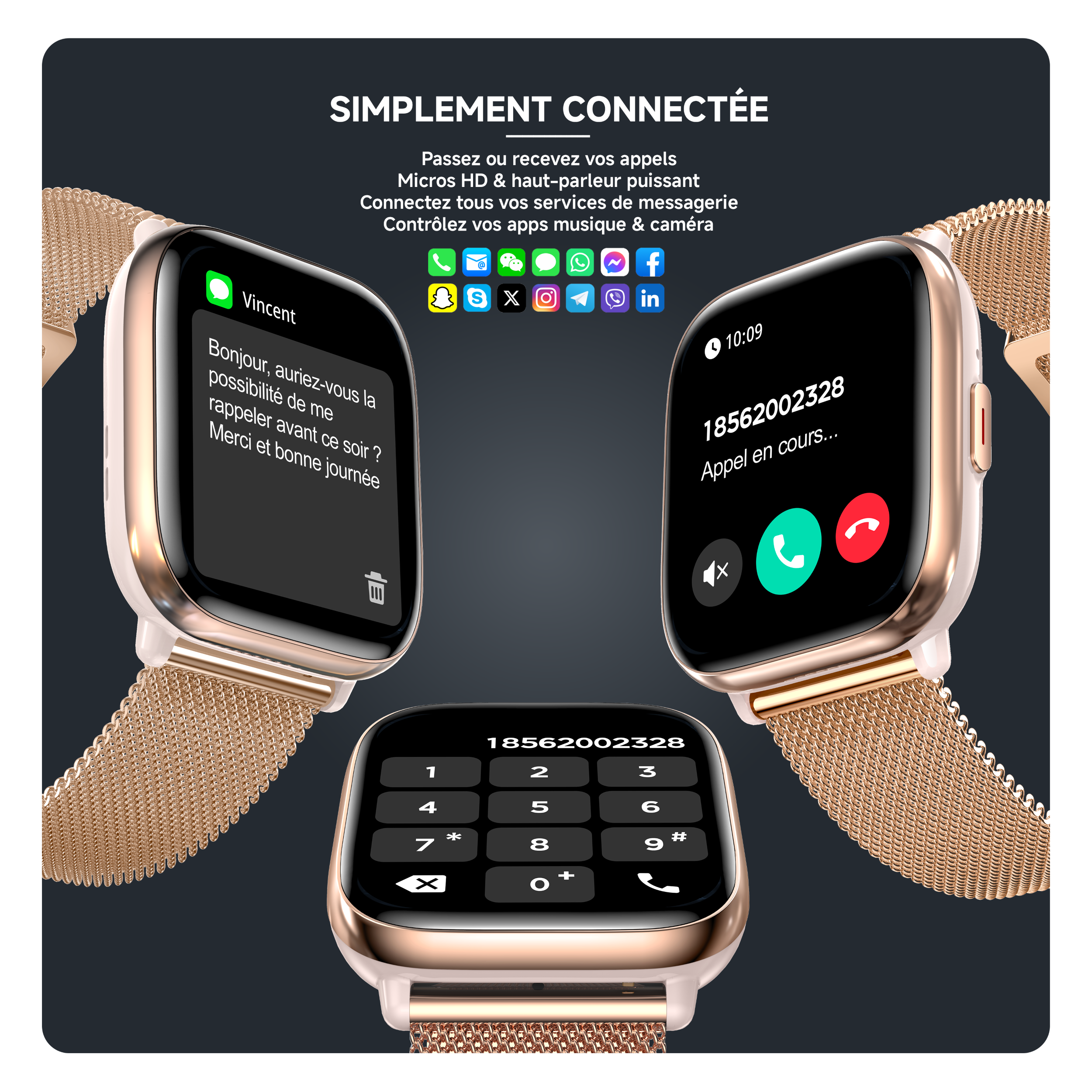 Montre connectée avec 1 bracelet métal + 1 bracelet gomme Finitions horlogères Autonomie 7 jours facile d'utilisation prise d'appel réception de messages contrôle audio-vidéo Capteurs santé surveillance du sommeil fonction sport