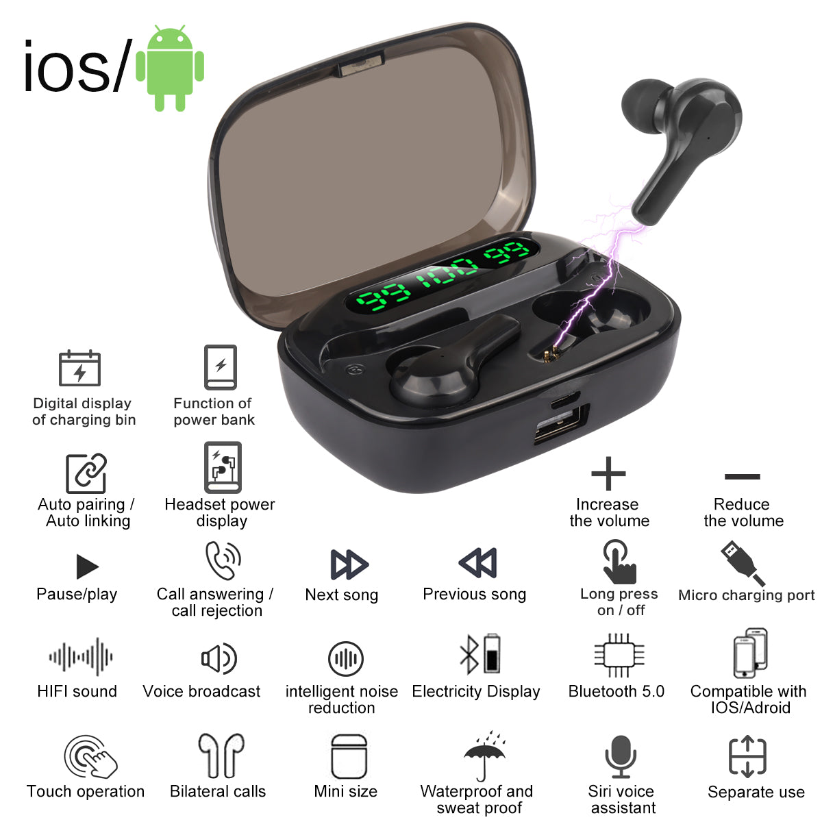• ECOUTEURS BLUETOOTH SANS FIL • Mini écouteurs sans fil disposant d’une très bonne qualité sonore. Facilement transportable et non encombrant, ils répondront à vos exigences en termes de qualité sonore. • De plus, leurs commandes tactiles vous permettent de rester au contrôle de votre écoute. • Le boîtier de chargement vous indique par sa lumière LED, le niveau de chargement des écouteurs. • Couleur : noir