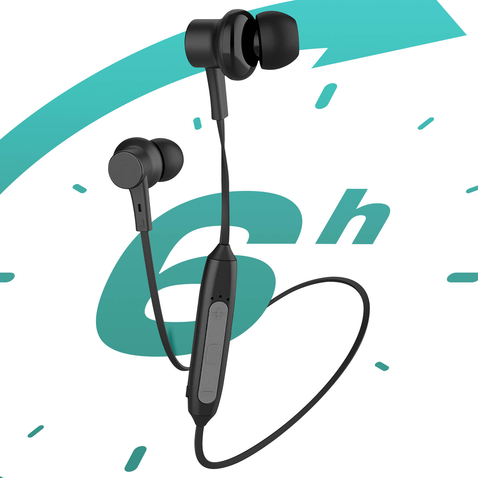 Écouteurs intra-auriculaires stéréo. Connexion sans fil Bluetooth. Télécommande avec microphone intégré pour gérer les musiques et appels. Oreillettes magnétique évitant les nœuds. Autonomie 6h en communication/4 jours en veille. Câble micro-USB inclus