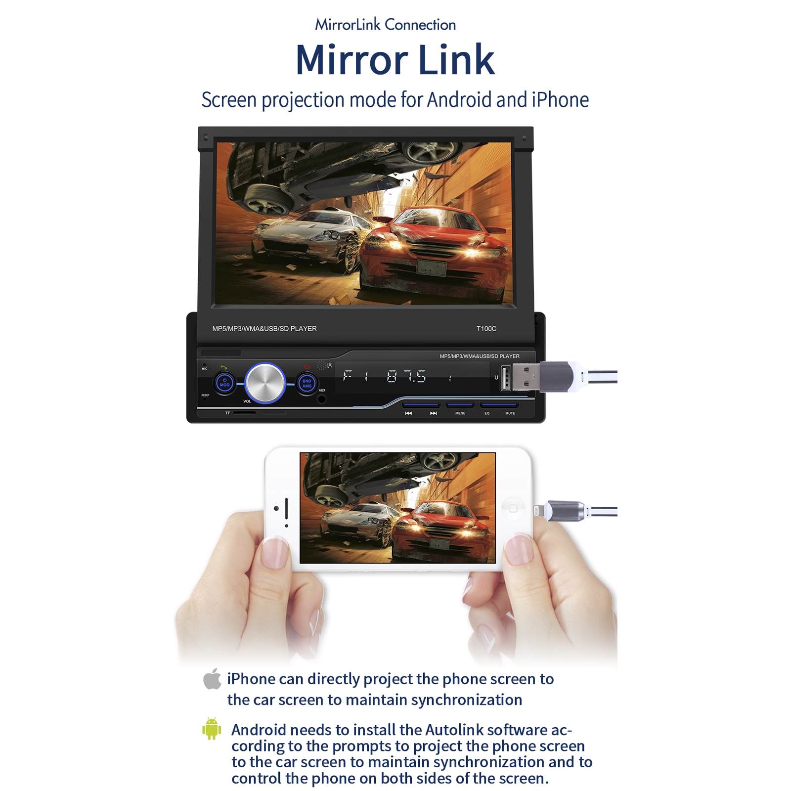 Doté de la version Bluetooth 5.0, cet autoradio vous permet de connecter votre téléphone pour écouter de la musique ou passer des appels en mains libres. Il supporte également la fonction Mirror Link, vous permettant de refléter l'écran de votre téléphone sur l'écran de l'autoradio. De plus, il est compatible avec les systèmes Android et IOS, et supporte la fonction Carplay filaire pour les téléphones IOS et la fonction Android AUTO.