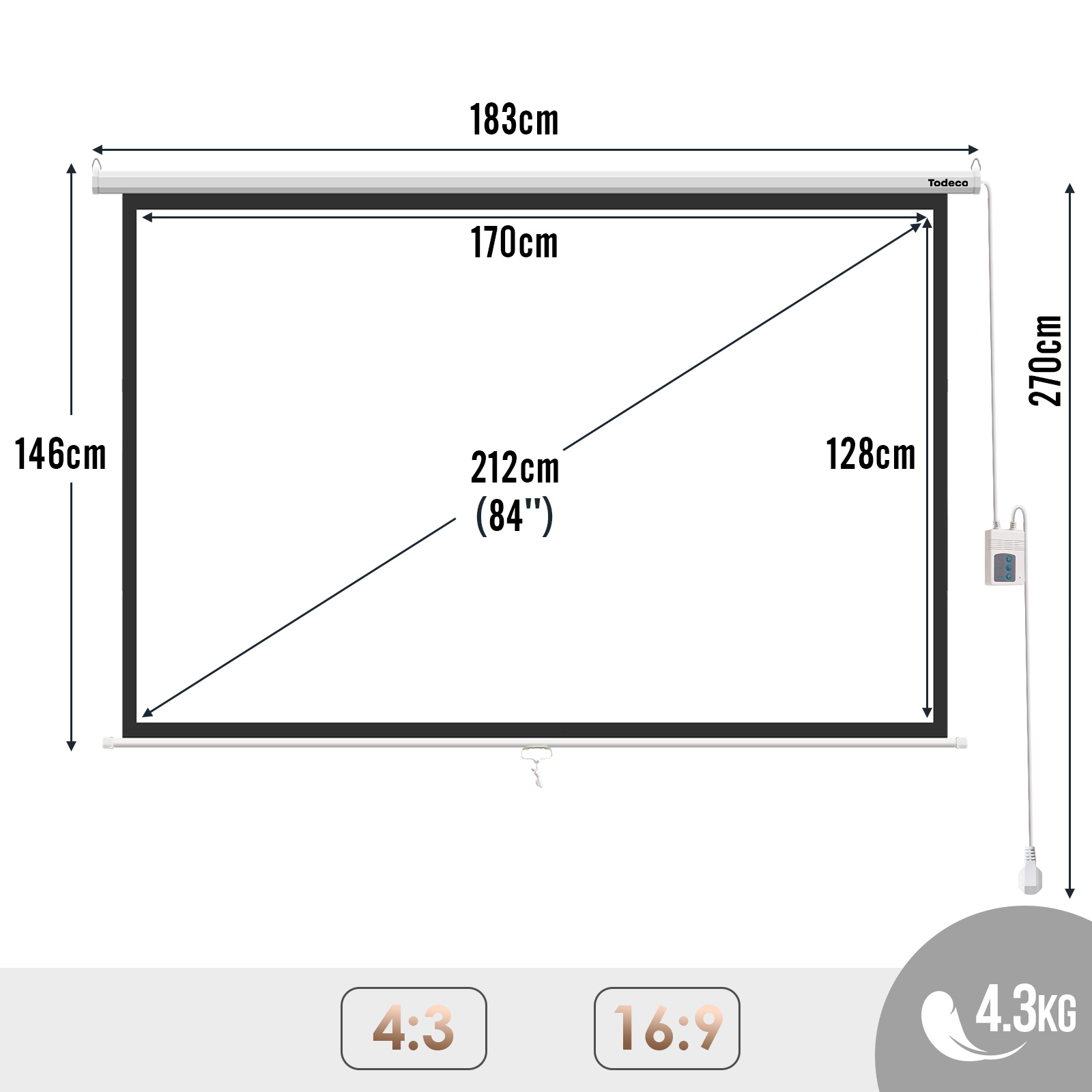| Libellé | Écran de Projection Moteur 84 Pouces, Écran de Moteur avec télécommande, Fixation Mur ou Plafond, pour Home Cinéma et Entreprise, 128 x 170 cm, Forma |