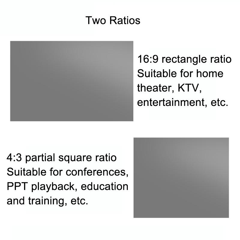 - Deux rapports d'aspect, 16:9 ratio rectangulaire, adapté pour le home cinéma, KTV, divertissement, etc. ; 4:3 ratio partiellement carré, adapté pour les conférences, la lecture de PPT, l'éducation et la formation, etc.