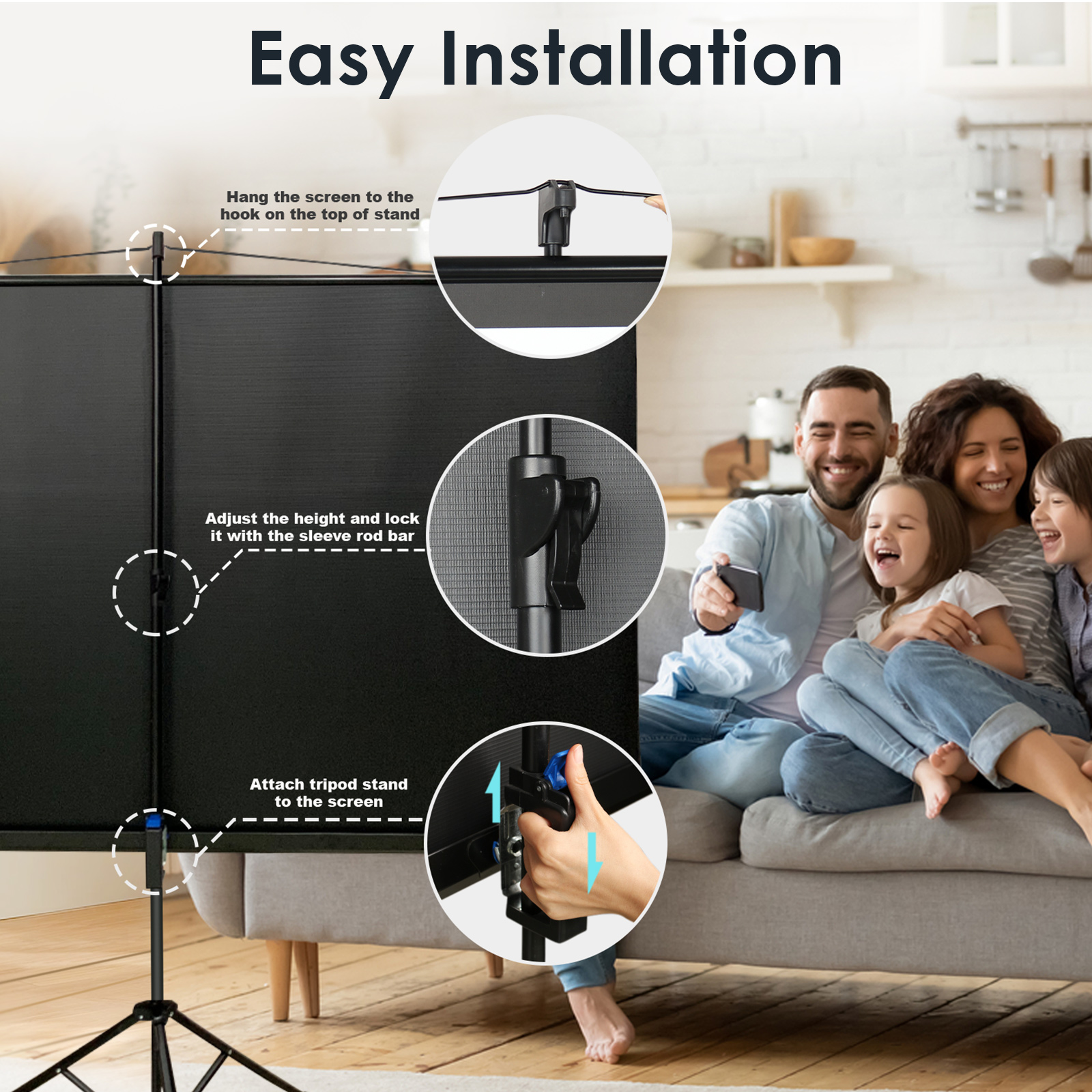 Profitez de votre projection : Cet écran de projection polyvalent convient aussi bien à une utilisation en intérieur qu'en extérieur, en en faisant le choix idéal pour les cinémas maison, les salles de classe, les bureaux, les mariages, les environnements éducatifs, les présentations en salle de réunion, les projections de films en plein air, et plus encore. Il accueille un large éventail de programmes, des événements sportifs et des films aux émissions de télévision et aux jeux vidéo.