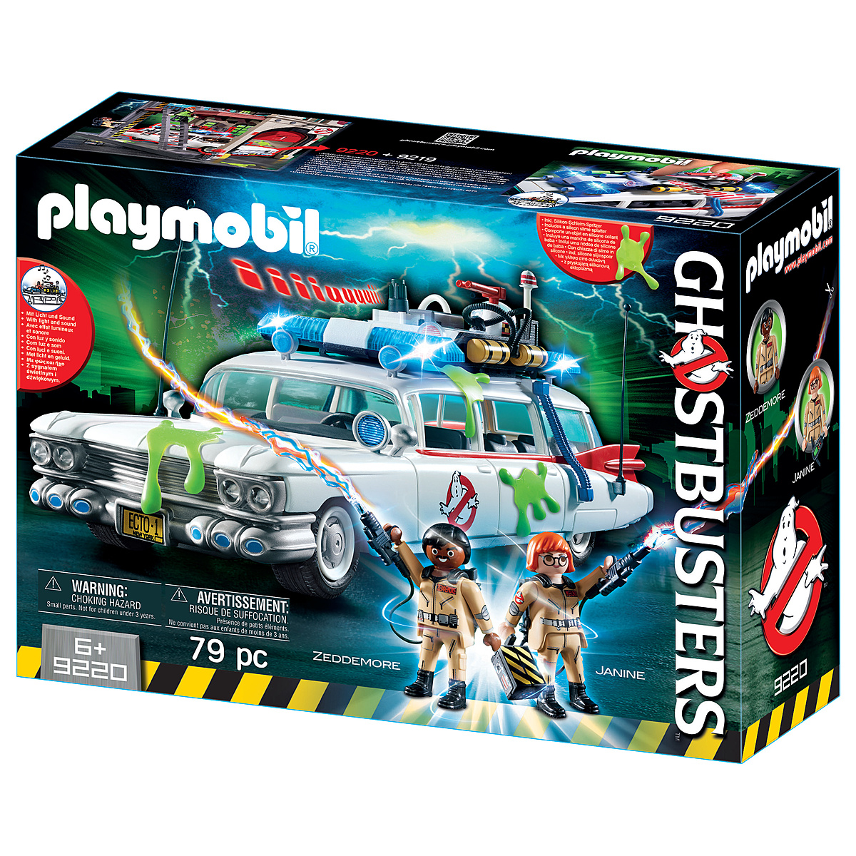 Plus produit 4 personnages Ghostbusters peuvent monter à bord du véhicule Ecto-1, avec leurs sacs à dos Proton Packs, les pièges à fantômes et d\'autres équipements.\n Avec 4 emplacements spécialement prévus pour les sacs à dos Proton Packs Ghostbusters.\n Le toit est amovible.\n Le coffre s\'ouvre.\n La sirène et la lumière bleue situées sur le toit peuvent être activées en utilisant 2 boutons.\n Autres accessoires : deux sacs à dos Proton Pack et armes à Proton, un piège à fantôme, le détecteur PKE pour détecter l\'énergie paranormale des fantômes et des projections d\'Ecto-Plazm qui se fixent sur une paroi lisse.
