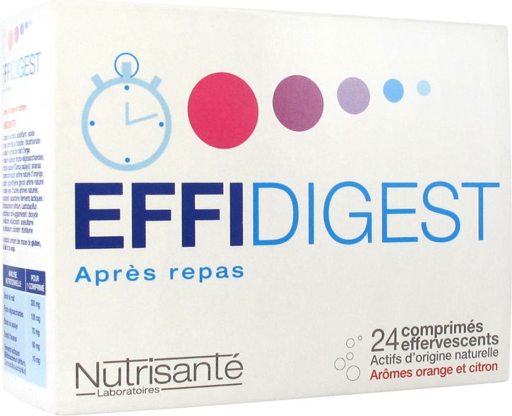 Nutrisanté Effidigest Après Repas 24 Comprimés Effervescents est un complément alimentaire dédié aux troubles pouvant être ressentis après le repas (lourdeurs, ballonnements, inconfort intestinal). A base d'extraits végétaux, ferments lactiques (Bifidobacterium bifidum et Lactobacillus aciidophilus) et fructo-oligosaccharides, sa formule contient de l'extrait de malt et des extraits de fruits exotiques (ananas et papaye) dotés d'une activité enzymatique. D'origine naturelle, aucun des actifs n'est susceptible d'entraîner un phénomène d'irritation digestive. Ce produit contient des édulcorants, des traces de gluten, de lait et de soja et une source de phénylalanine. Arômes orange et citron.