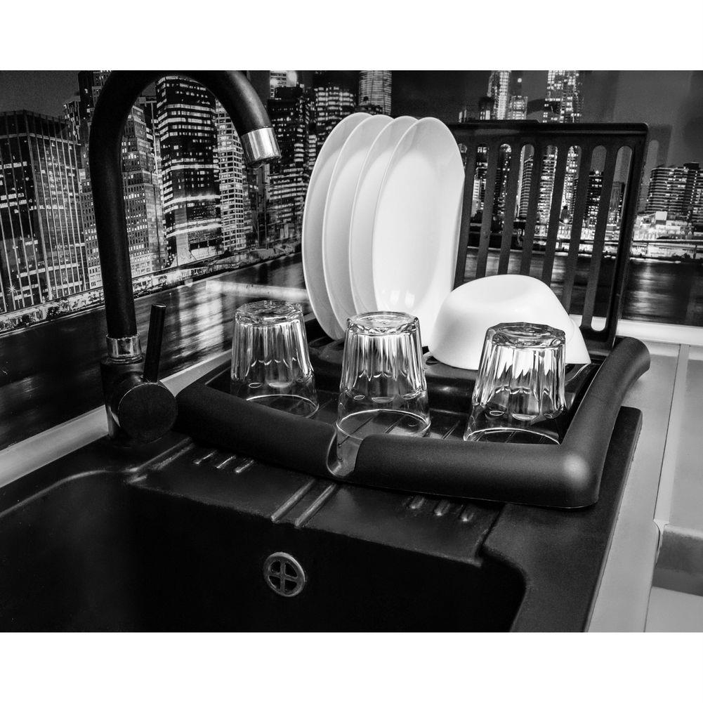 Égouttoir à vaisselle rabattable avec espace pour assiettes, verres, tasses ou bols. Le sèche-linge est fabriqué en plastique de haute qualité dans une couleur noire à la mode. Le séchoir plié prend peu de place, surtout lorsque l'espace est limité. Il a un entonnoir pratique, grâce auquel nous nous débarrasserons de l'eau de la vaisselle qui coule dans l'évier. Contrairement aux égouttoirs en acier, il n'y a aucune possibilité de formation de rouille. Facile à nettoyer. Le produit original de la marque Wilde.