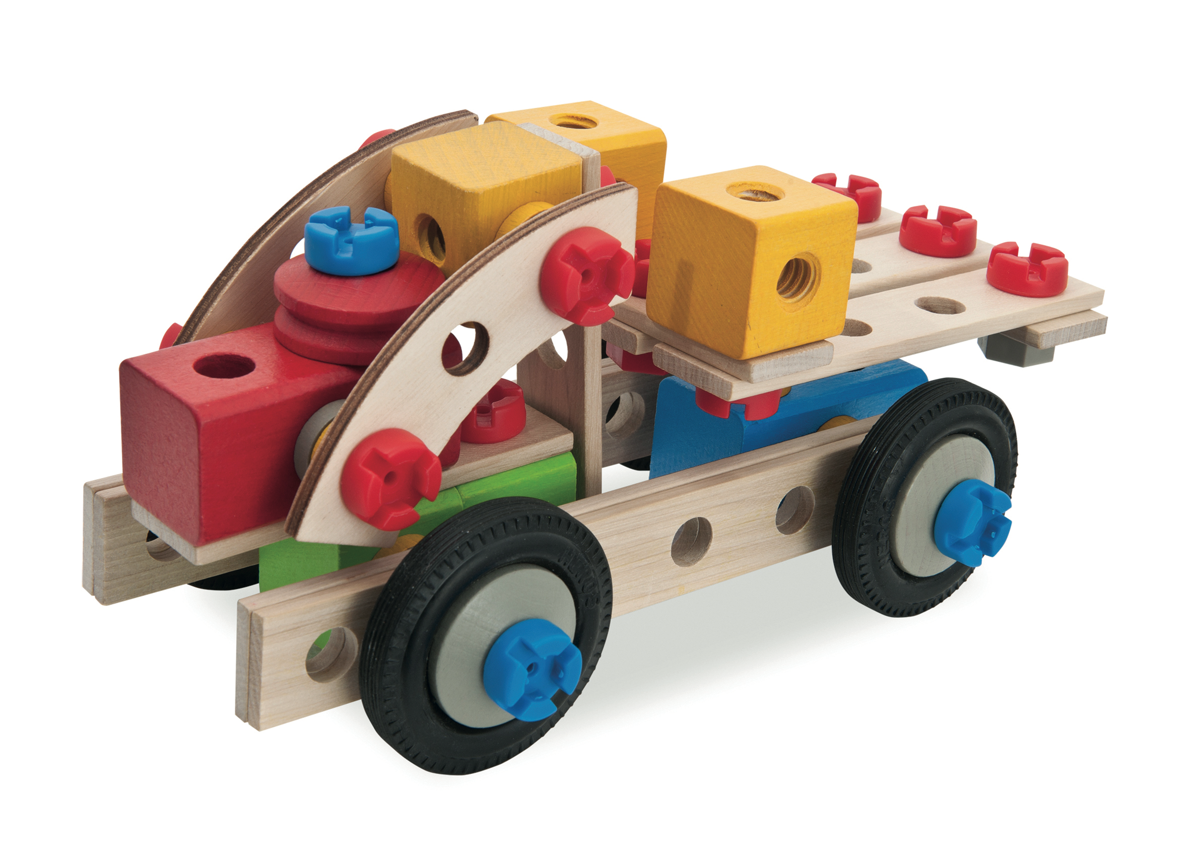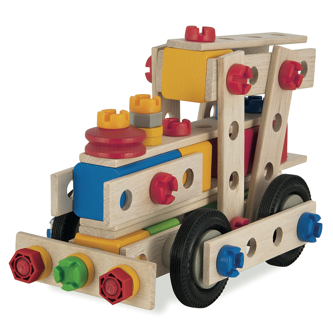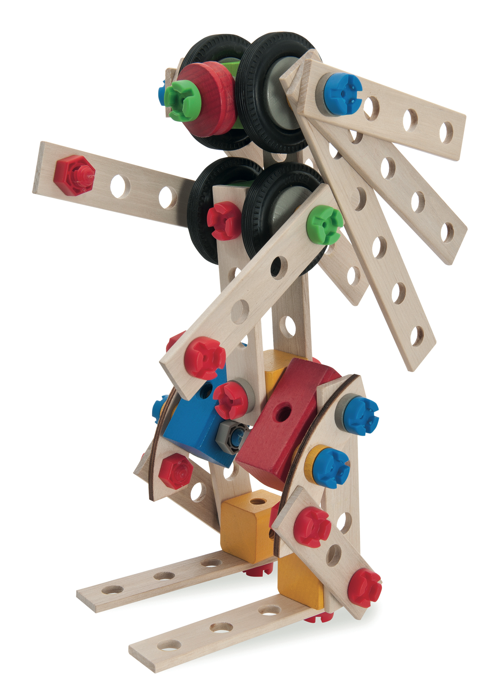 Coffret de 100 pièces comprenant des lamelles de bois de hêtre perforées, des vis en plastique, des roues en caoutchouc, et un tournevis pour construire des véhicules ou autre. 4 modèles de construction : locomotive, avion, dépanneuse, et robot. Bois de hêtre labellisé FSC. Pour les enfants à partir de 4 ans. Fabrication allemande.