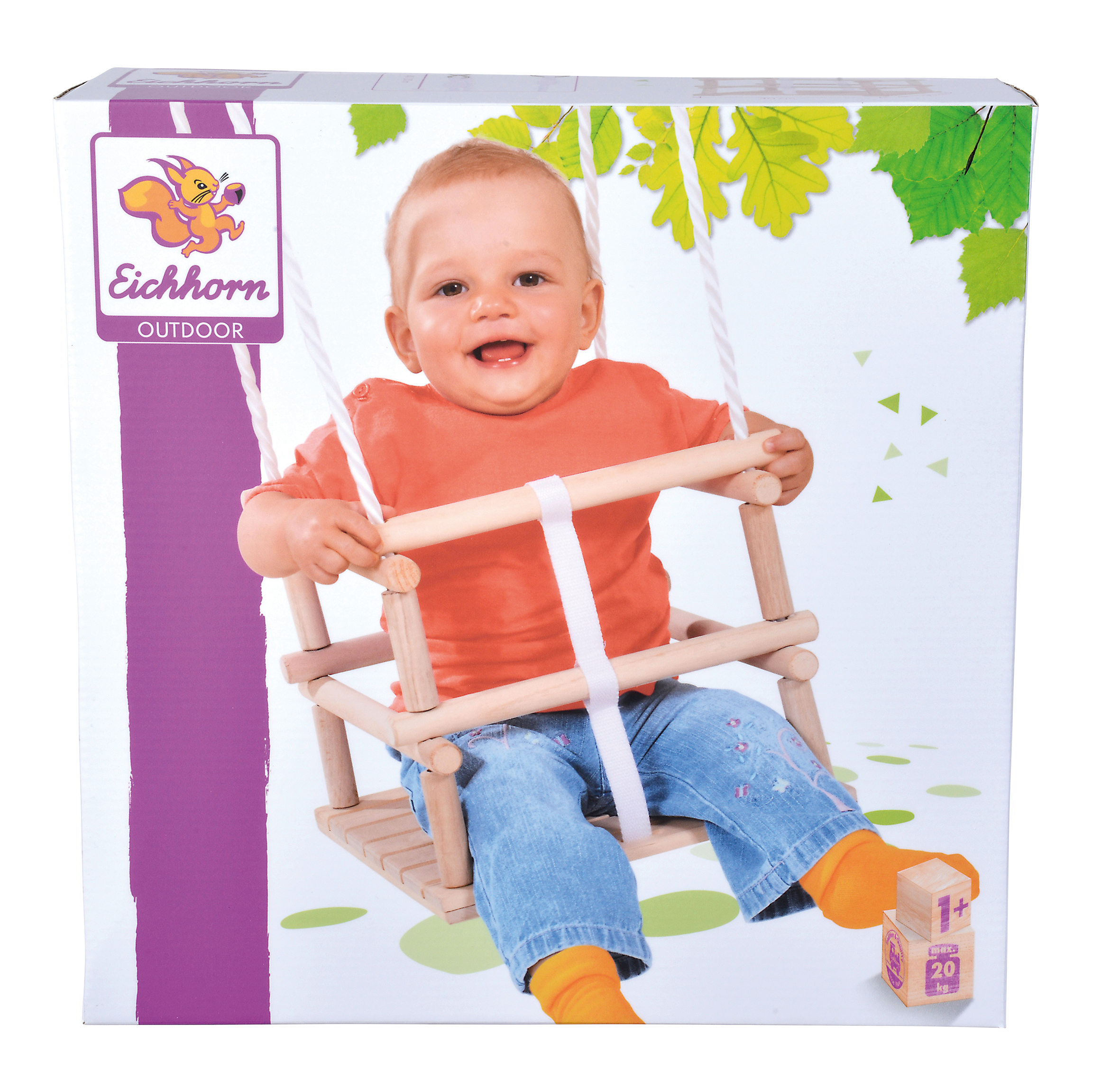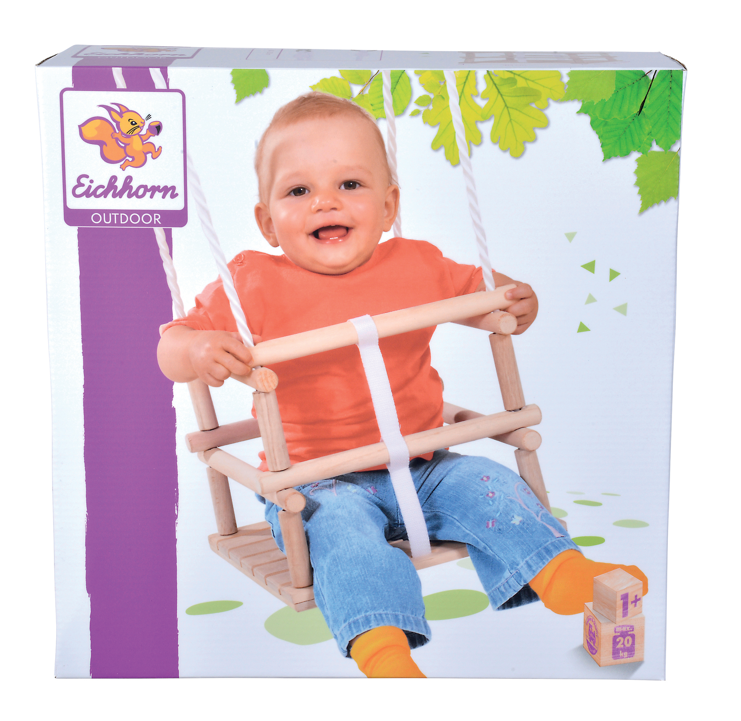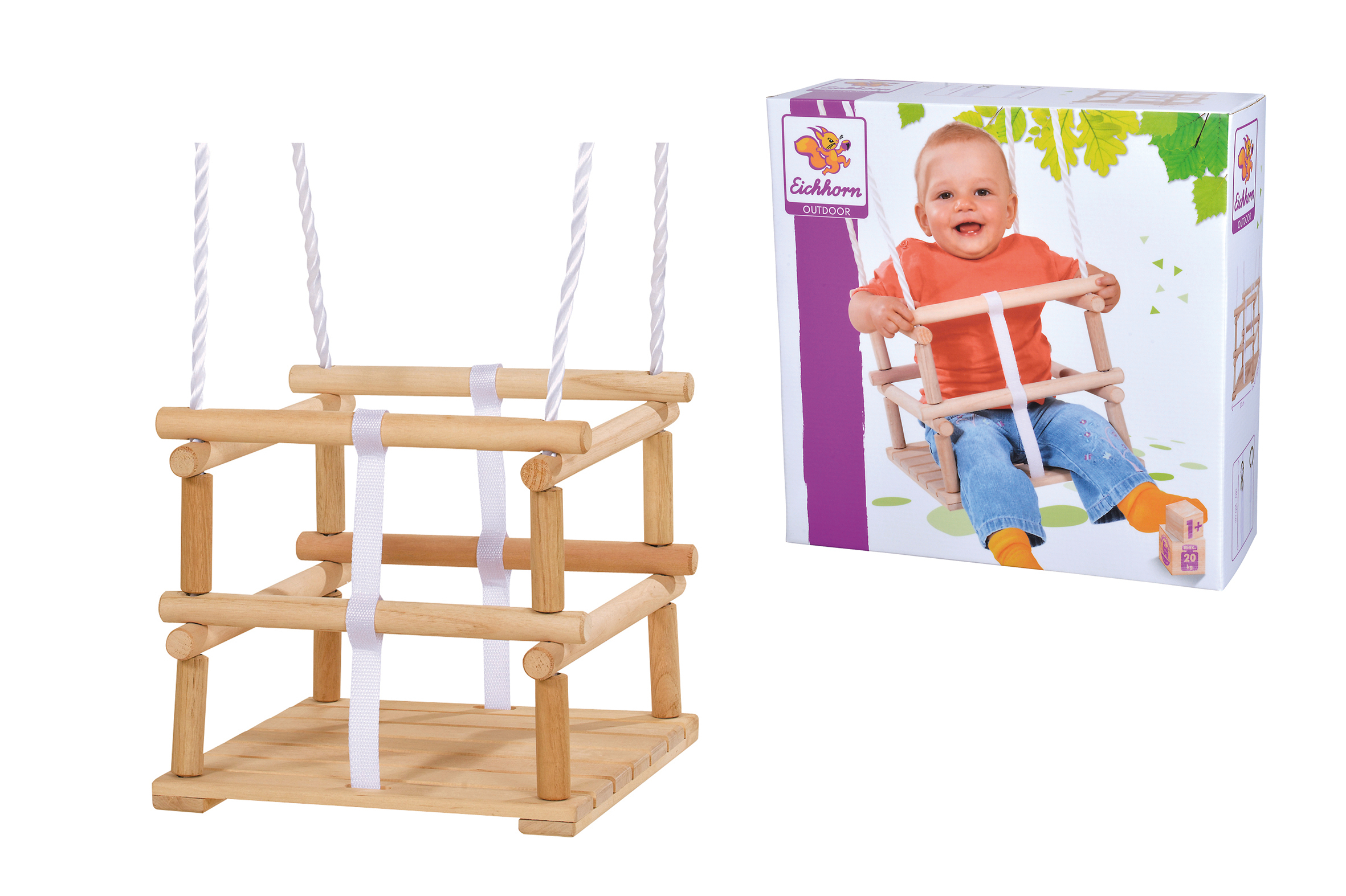Balancoire pour bébé en bois de bouleau avec une surface d'assise de 30x30cm. Possibilité de régler la hauteur entre 140cm et 210cm. Poids utilisateur max : 20kgs.