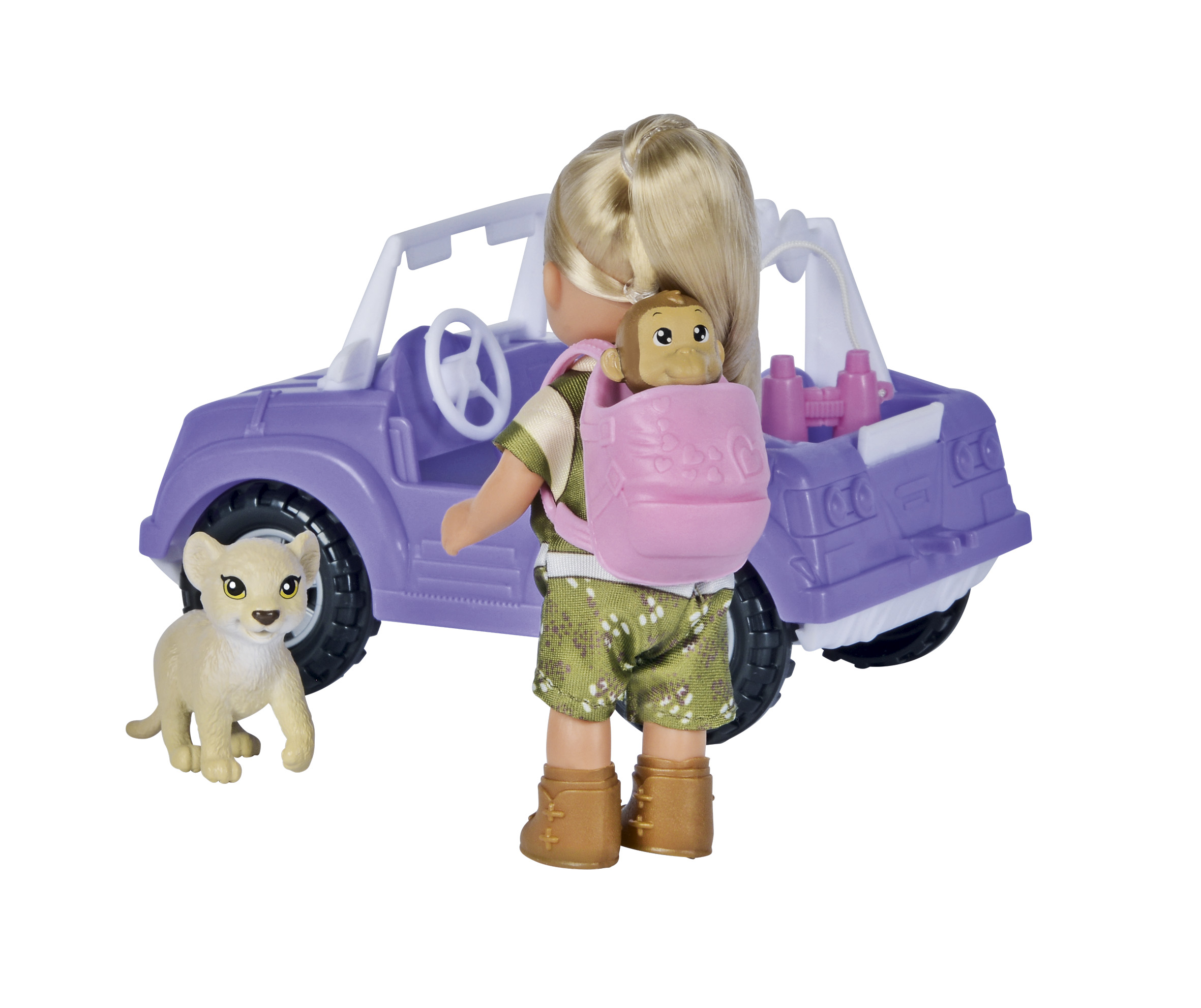 Mini poupée mannequin 12cm. Evi dans sa voiture 4x4 et part en safari. Inclus : 1 lionceau + 1 singe + 1 sac à dos + 1 paire de jumelles Pour les enfants à partir de 3 ans.