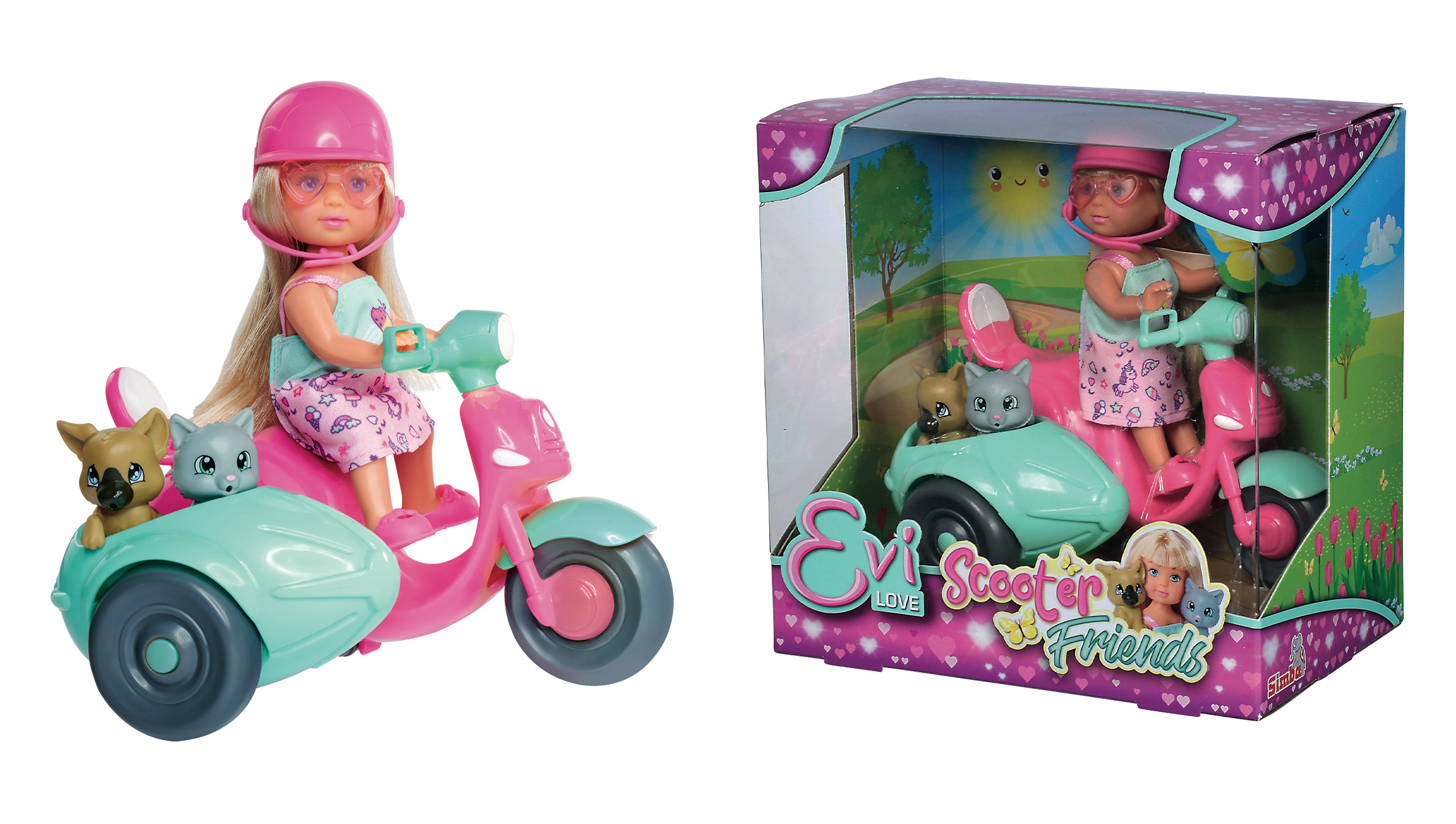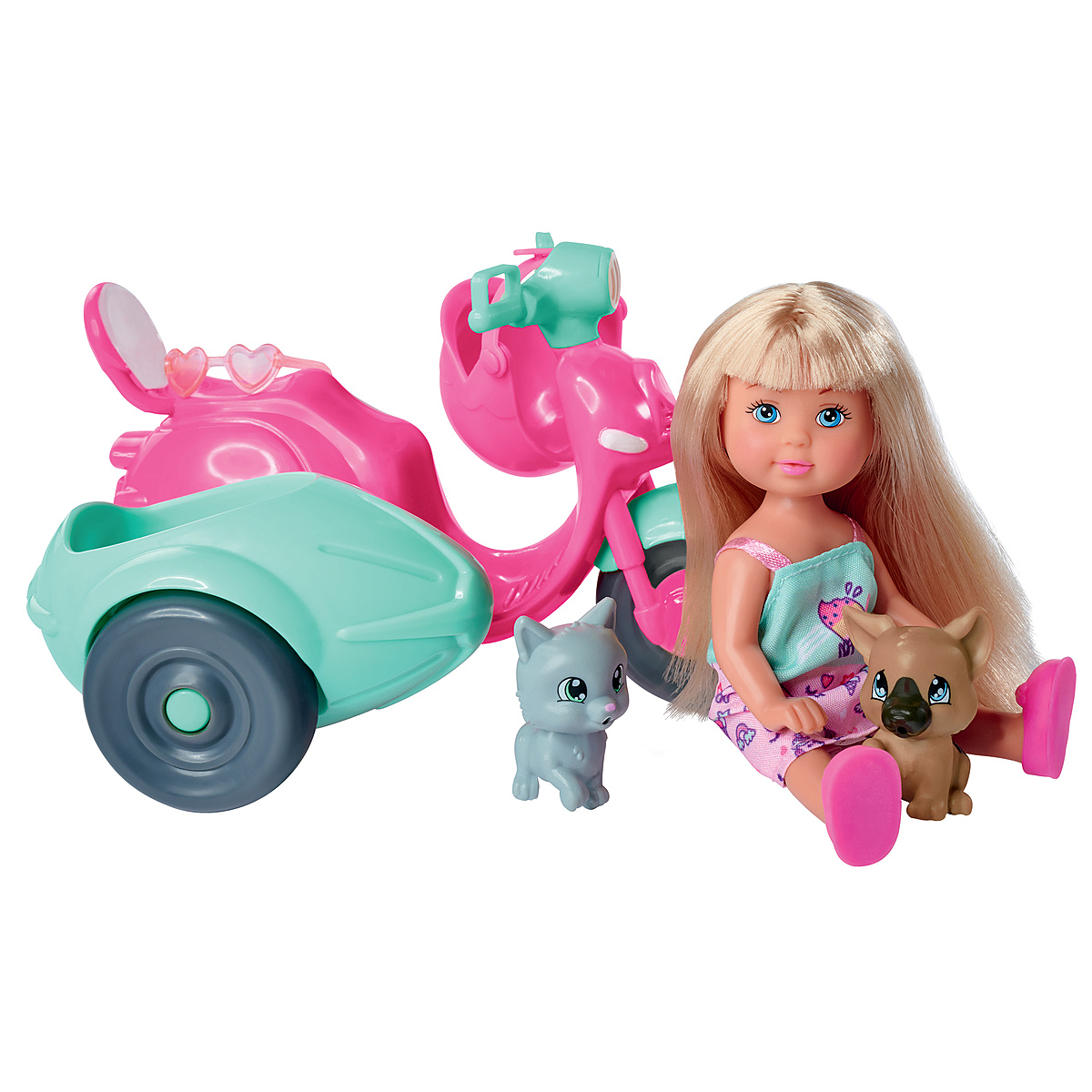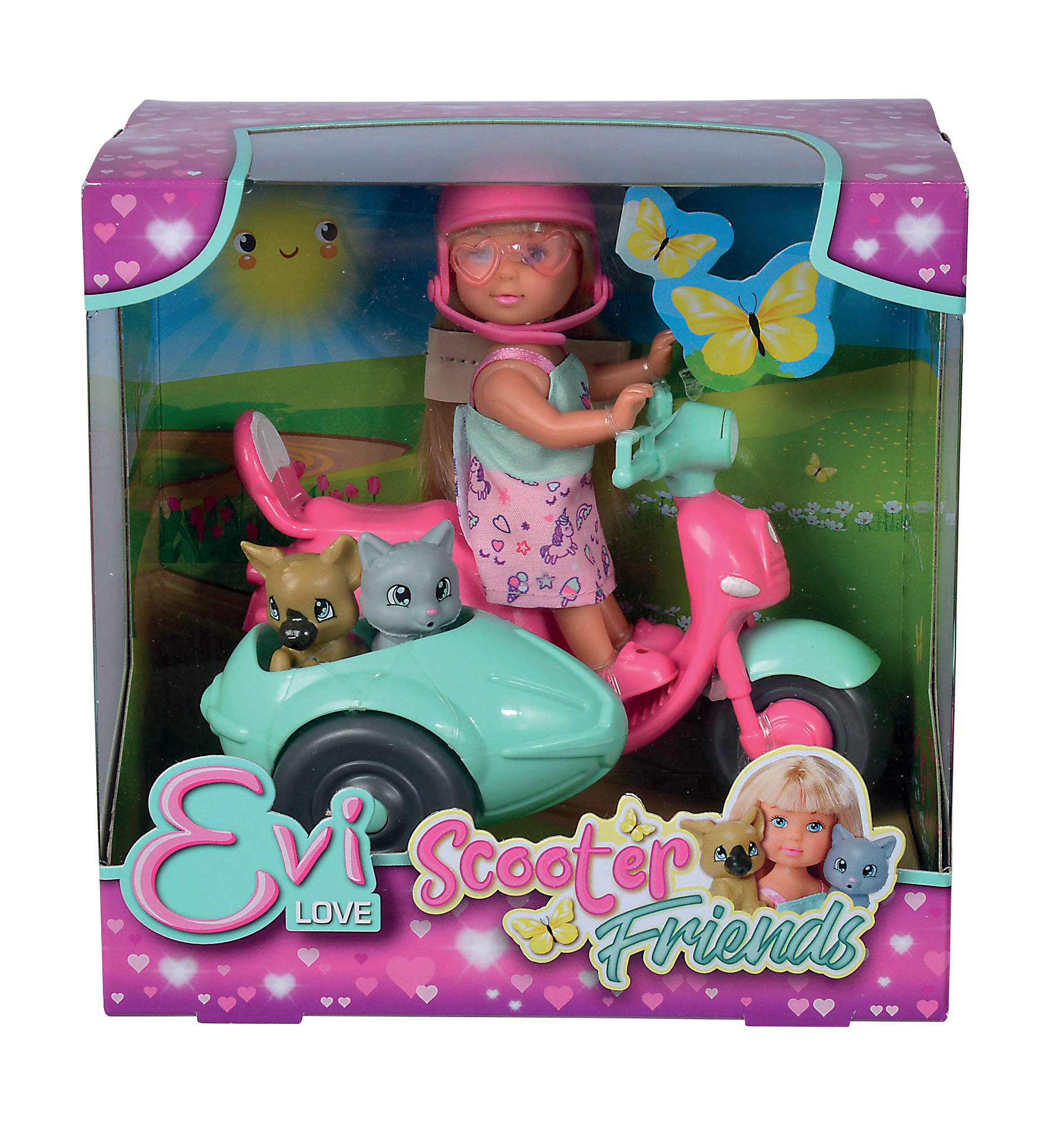 Mini poupée mannequin Evi 12cm. Evi part en balade sur son scooter rose et bleu. Le sidecar permet d'amener son chat et son chien dans ses aventures. Casque de protection inclus.