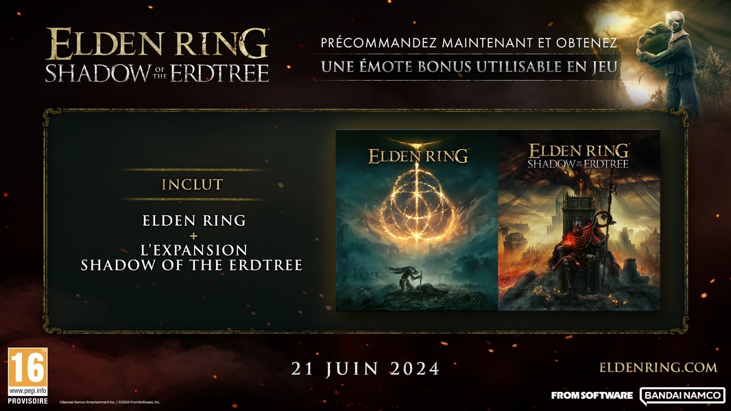 ELDEN RING, lauréat de centaines de distinctions dont celles de \"Jeu de l'année\" aux Game Awards et \"Jeu de l'année ultime\" aux Golden Joystick Awards, ouvre la porte d'une nouvelle aventure aux Sans-éclat de l'Entre-terre. Le DLC ELDEN RING Shadow of the Erdtree est la plus vaste extension jamais développée par FromSoftware, et l'occasion pour les joueurs de plonger au coeur du mystère qui entoure le monde de ce jeu unanimement salué par la critique. Une nouvelle histoire Guidés par l'Empyréen Miquella, les joueurs se rendront dans le Royaume des ombres, une contrée occultée par l'Arbre-Monde et lieu de la première manifestation de la déesse Marika. Dans cette région inédite et insolite, ils exhumeront de sombres secrets et feront connaissance avec d'autres individus marchant dans les pas de Miquella et animés par leurs propres ambitions.