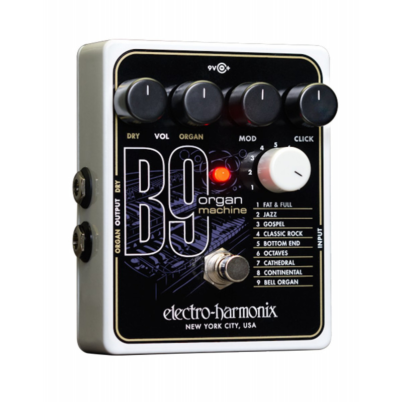 Mike Matthews, créateur d'Electro Harmonix, a toujours su surprendre les adeptes de ses effets originaux. La toute nouvelle B9 Organ Machine ne fait pas exception. En effet, à coup d'octavers, de chorus, de flangers, tremolos, fuzz et autres, on trouve 9 presets synthetisant le son et le grain de grandes catégories d'orgues série B. Les potentiomètres Mod et Click contrôlent différents régalges en fonction du preset sélectionné :