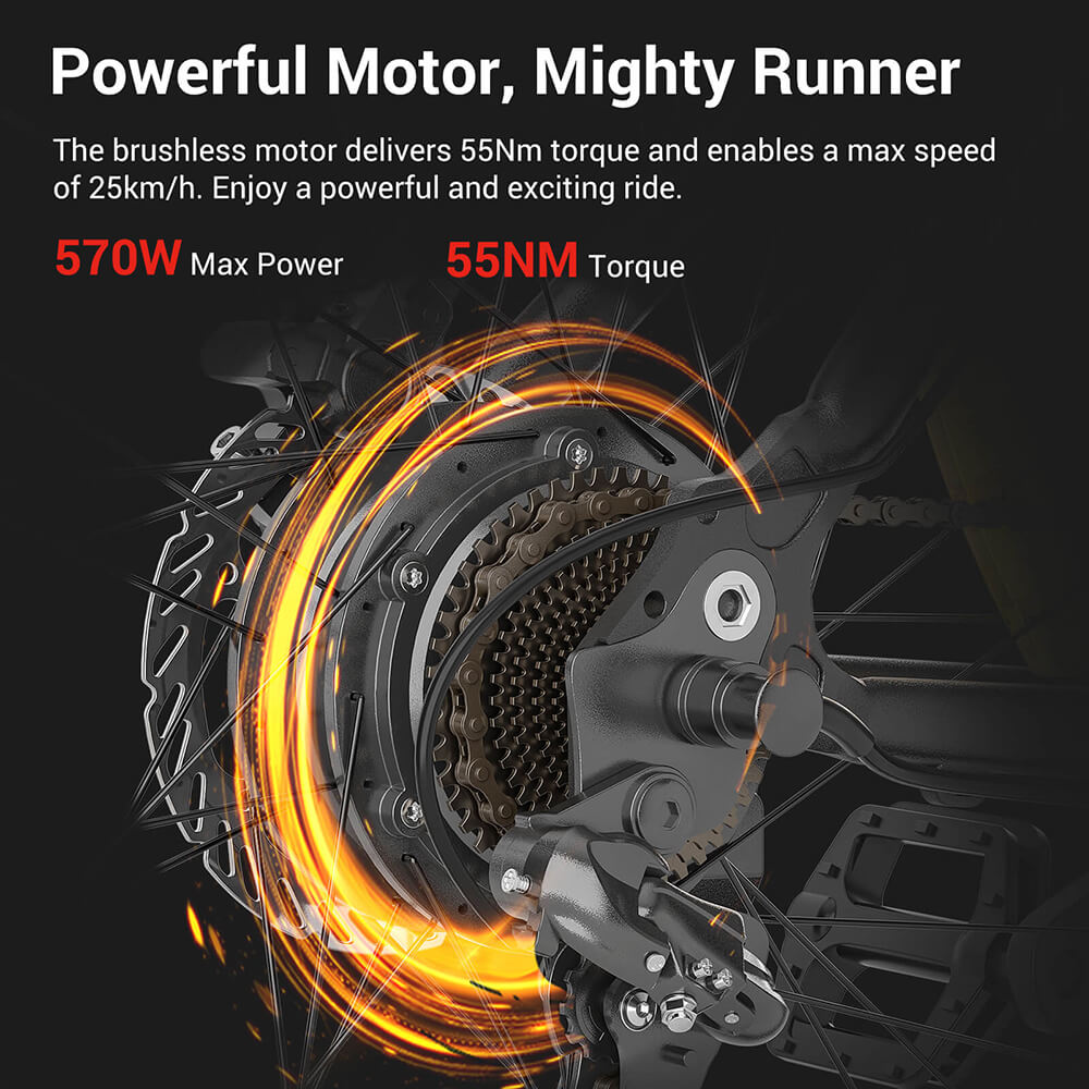 L'Eleglide Mopride 2 est équipé d'une batterie lithium-ion remplaçable de 561,6 Wh (36 V 15,6 Ah), qui permet de parcourir facilement jusqu'à 130 km par charge en mode assisté, vous libérant de toute inquiétude d'autonomie. Avec son moteur brushless puissant délivrant un couple de 55 Nm, une puissance instantanée maximale de 570 W et une vitesse maximale de 25 km/h, accélérer et gravir des montées abruptes est un jeu d'enfant.