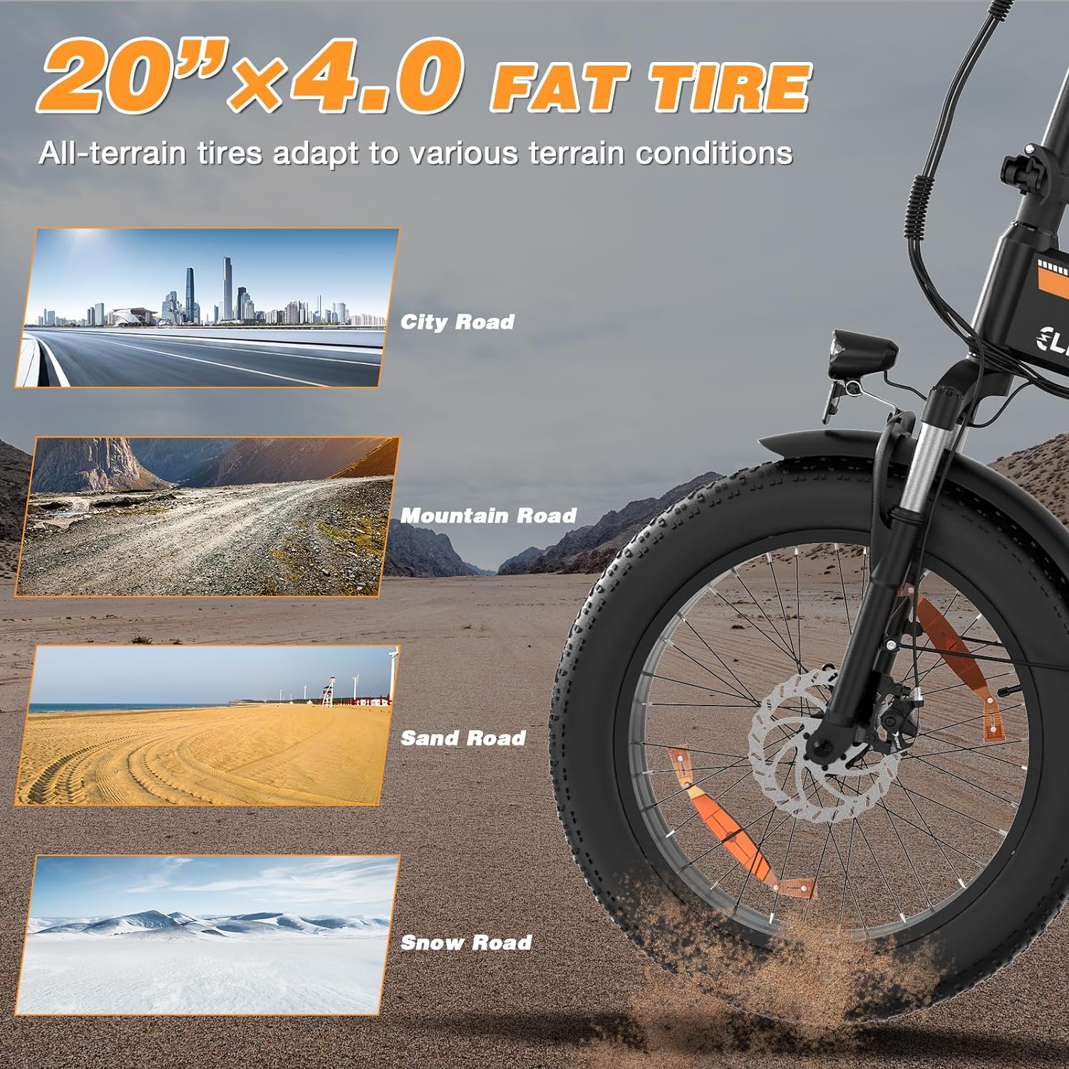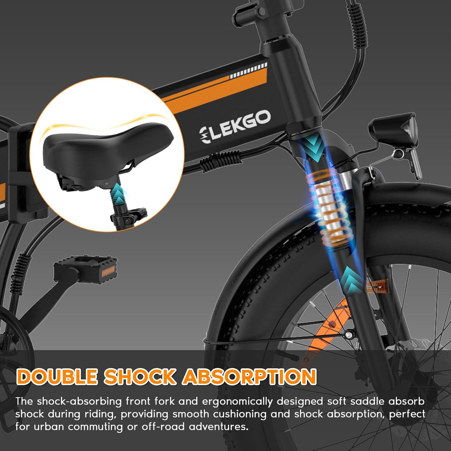 √ Excellent Confort Ce vélo électrique utilise des pneus larges de 20 "x 4,0, une conception de pneus tout-terrain, qui peuvent offrir une excellente adhérence et une excellente stabilité dans diverses conditions routières, garantissant une expérience de conduite fluide. Absorption des chocs La fourche avant absorbe les chocs pour une conduite plus douce. ride, parfait pour les déplacements en ville ou les aventures hors route.