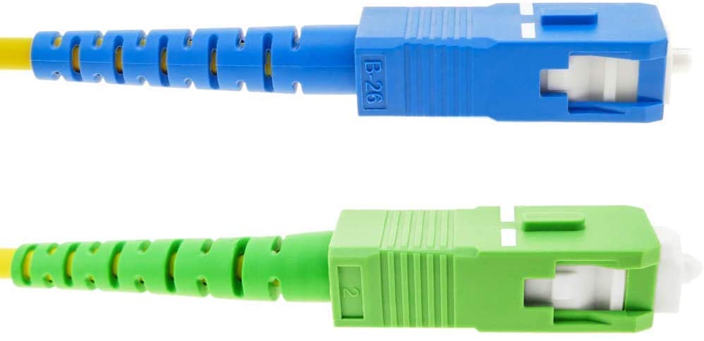Câble à fibre optique monomode (SM). Il possède un connecteur SC/APC à une extrémité et un connecteur SC/UPC à l'autre extrémité.
