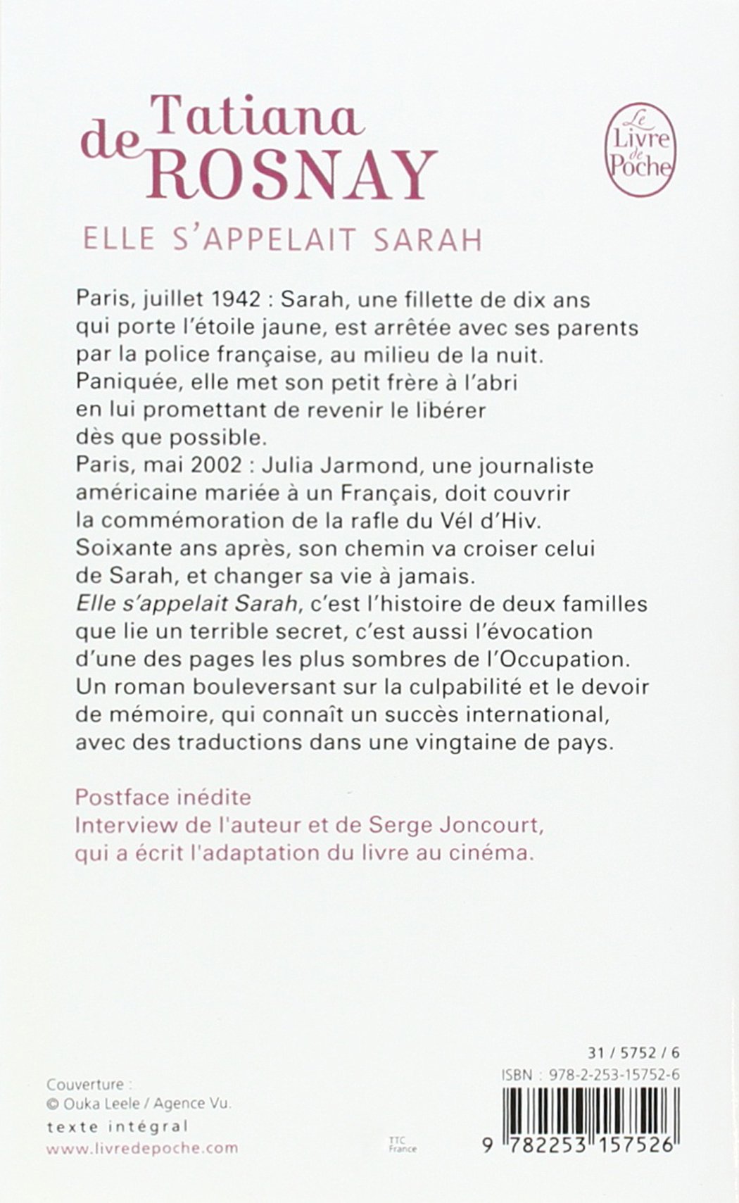 Elle s'appelait Sarah, c'est l'histoire de deux familles que lie un terrible secret, c'est aussi l'évocation d'une des pages les plus sombres de l'Occupation. Un roman bouleversant sur la culpabilité et le devoir de mémoire, qui connaît un succès international, avec des traductions dans une vingtaine de pays.