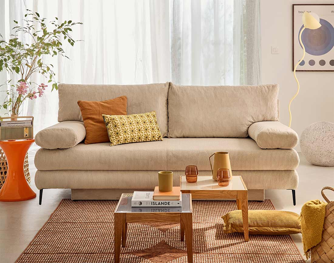 | Libellé | Elton - canapé 3 places convertible avec coffre en velours côtelé |