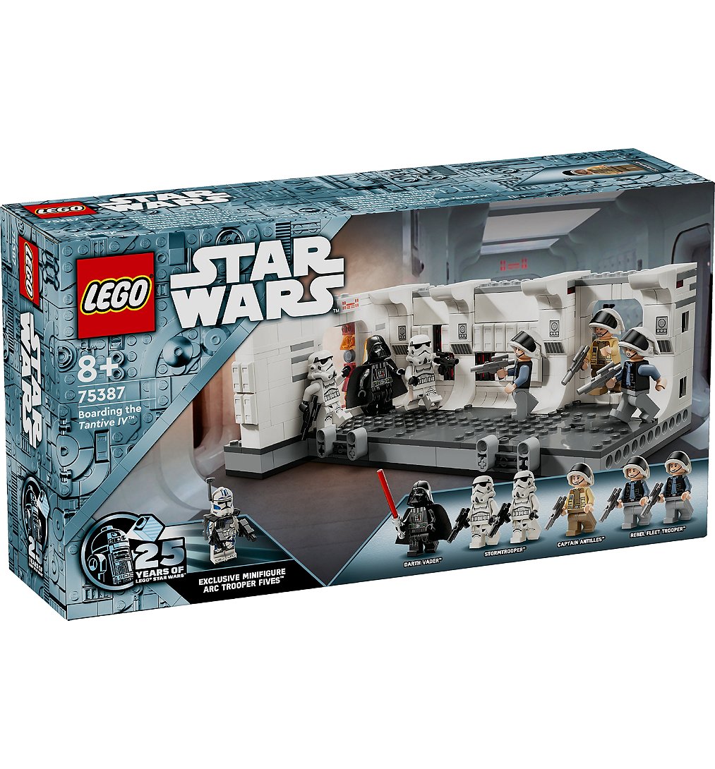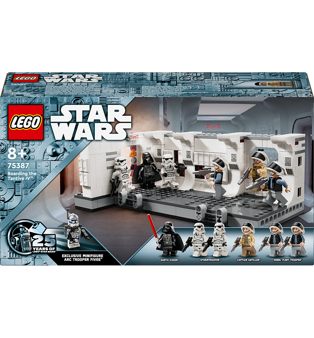 Revivez la scène où Dark Vador et ses Stormtroopers abordent le Tantive IV dans Star Wars : Un nouvel espoir avec ce set (75387) pour enfants dès 8 ans. Il inclut une réplique détaillée du couloir du Tantive IV où les Stormtroopers de Dark Vador affrontent les soldats rebelles du Capitaine Antilles, avec des leviers permettant de « faire sauter » la porte d’entrée et de faire tomber les personnages pendant les combats. Grâce aux connecteurs, les constructeurs peuvent ajouter un second set 75387 (vendu séparément) pour agrandir le couloir. Ce fantastique set à collectionner inclut 7 minifigurines LEGO® Star Wars™, dont Dark Vador, 2 Stormtroopers, 2 soldats rebelles et le Capitaine Antilles, ainsi que des accessoires. Beau cadeau pour les jeunes fans et les collectionneurs d’objets Star Wars, ce jouet de construction inclut également une minifigurine de l’ARC Trooper Fives accompagnée d’un socle, célébrant le 25e anniversaire de LEGO Star Wars.