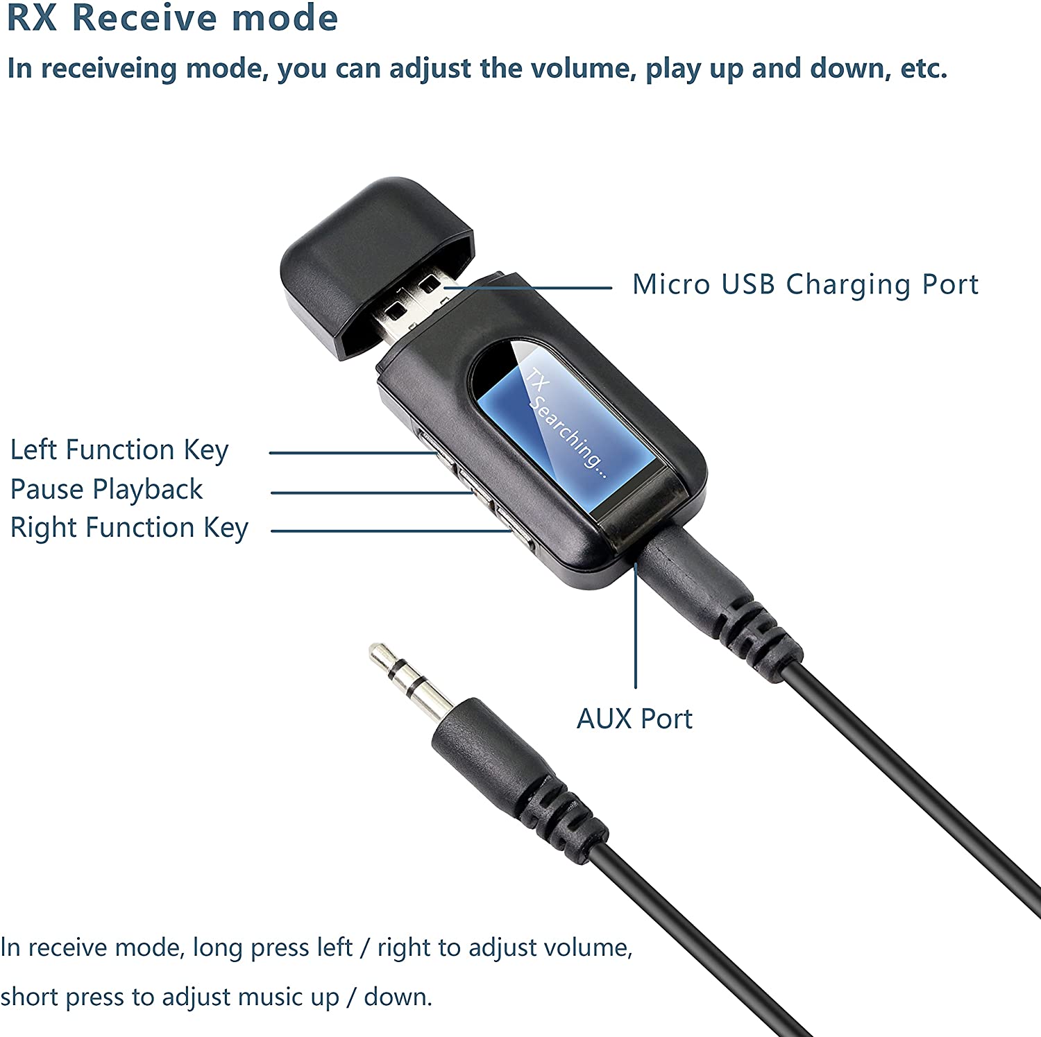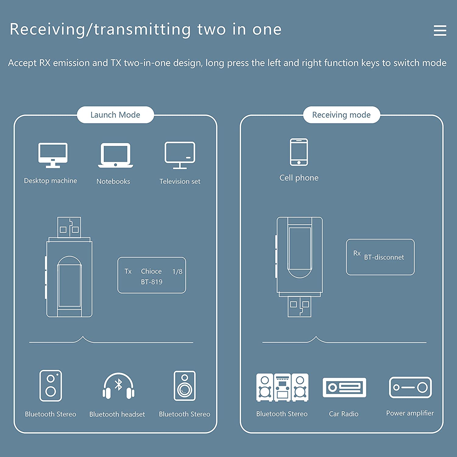Émetteur et récepteur : L'adaptateur audio universel Bluetooth 5.0 permet au téléviseur et à d'autres appareils non Bluetooth de diffuser de l'audio vers des écouteurs sans fil via Bluetooth. À l’inverse, il devient par exemple possible pour la chaîne stéréo de recevoir sans fil de la musique provenant de téléphones portables et de tablettes.