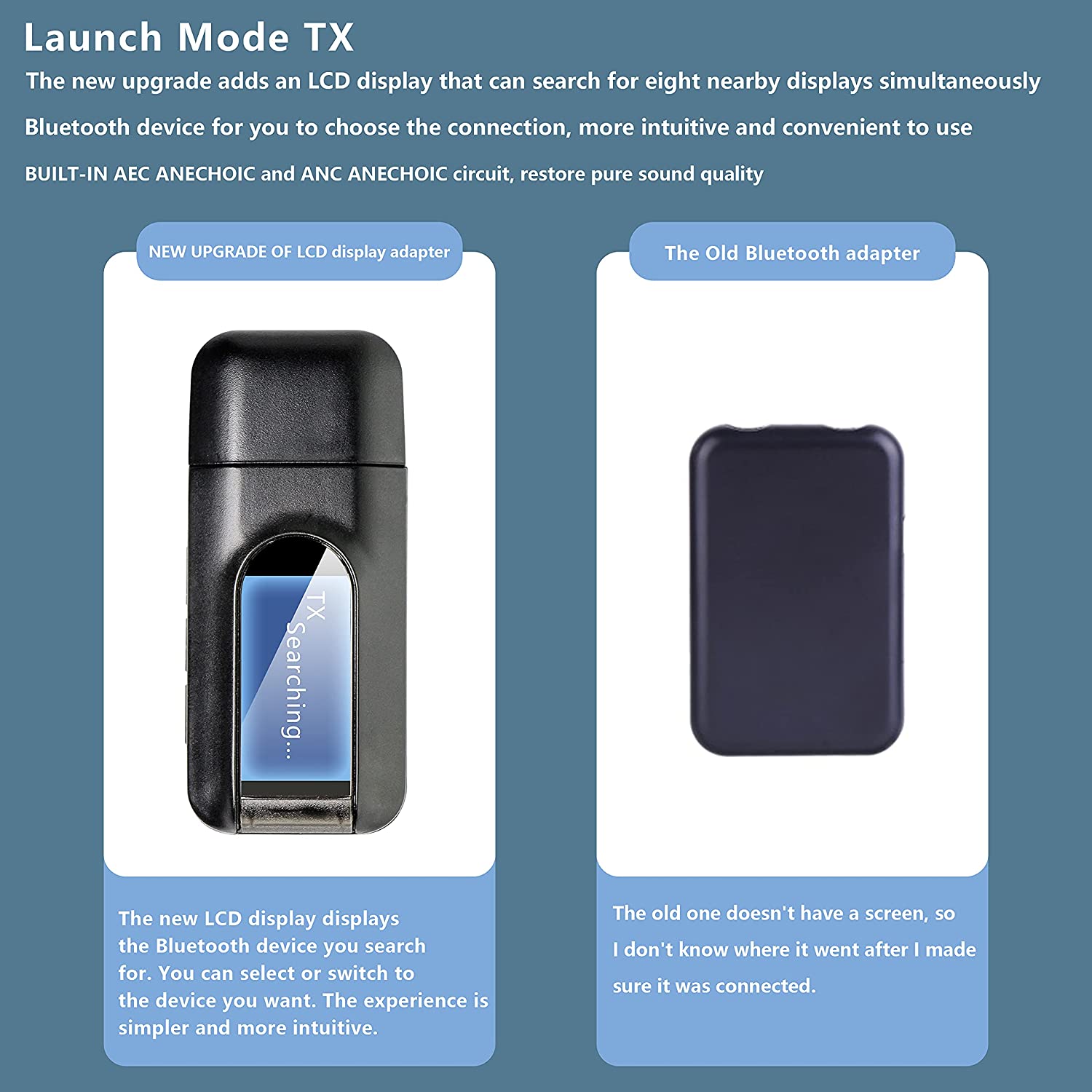 Écran LCD clair : L'écran permet d'afficher facilement si le produit est en mode TX ou en mode RX, et il est pratique de sélectionner les appareils Bluetooth à connecter.