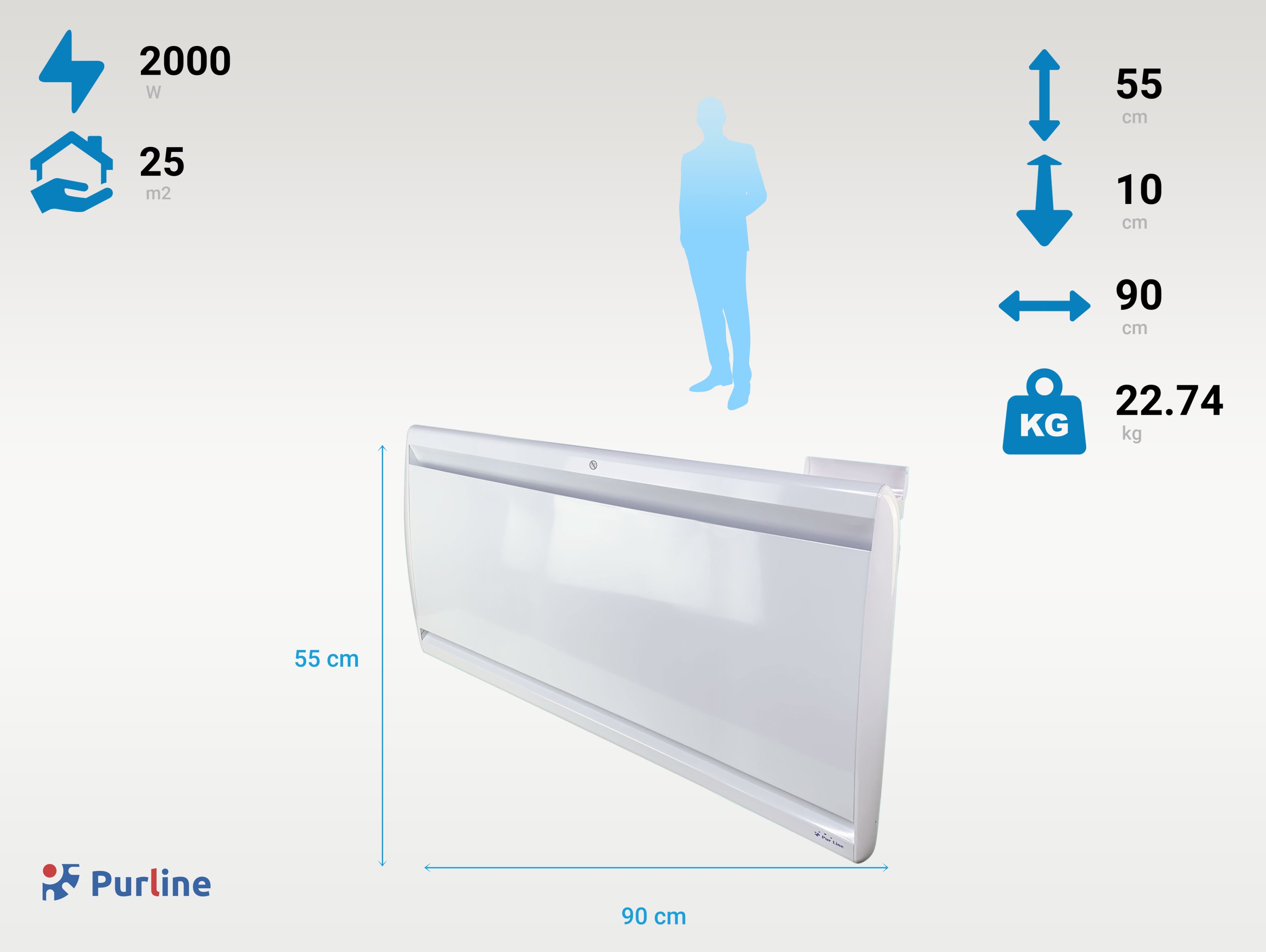 Son design blanc rectangulaire est élégant et compact, et comprend tout le nécessaire pour une installation murale. Ses dimensions (modèle 1000W : 60 x 55 x 10 cm, modèle 1500W : 75 x 55 x 10 cm, modèle 2000W : 90 x 55 x 10 cm) et sa solidité vous permettront de le déplacer selon vos besoins.