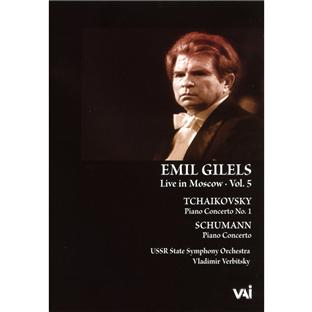 EMIL GILELS : EN DIRECT DE MOSCOU, VOL. 5. Gilels interprète le Concerto pour piano n° 1 en si bémol mineur de Tchaïkovski et le Concerto pour piano en la mineur de Schumann. En bis, il joue l'« Arabesque » de Schumann pour piano seul. Ces enregistrements publics (1966/1976) sont réalisés avec l'Orchestre symphonique d'État de l'URSS sous la direction de Vladimir Verbitsky. Couleur/Noir et blanc, 79 min.