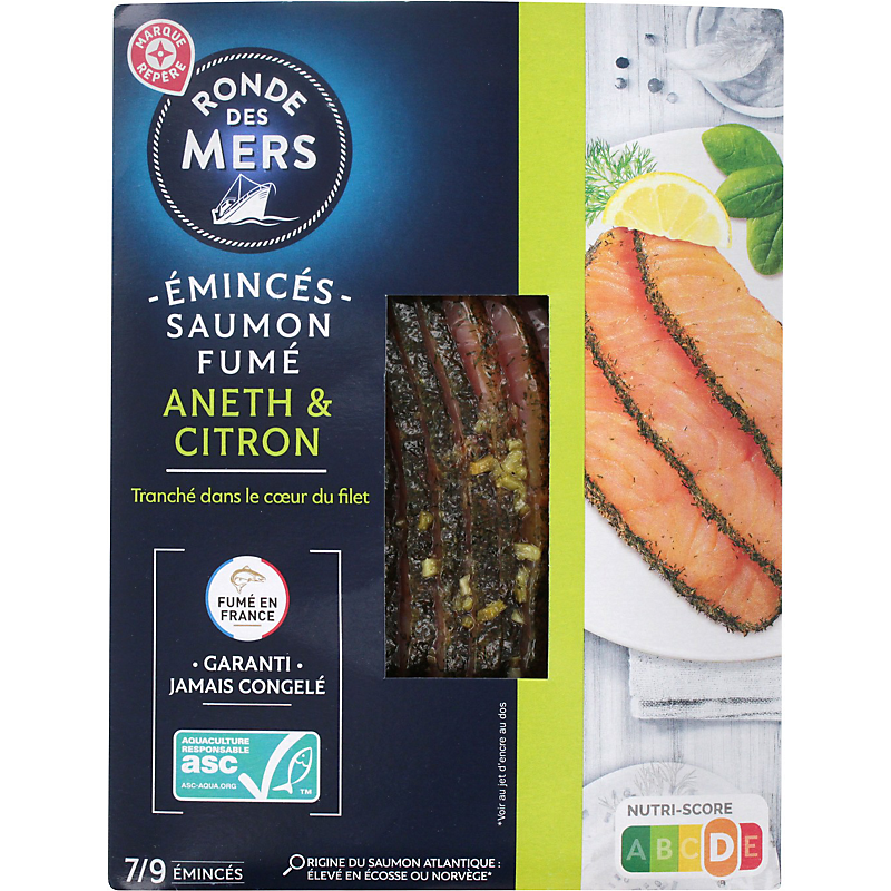 Emincés de saumon Atlantique (Salmo salar) élevé en Norvège ou au Royaume-Uni (Ecosse)*, fumé au bois de hêtre, à l'aneth et au citron *Pays d'élevage : voir ci-dessous RONDE DES MERS